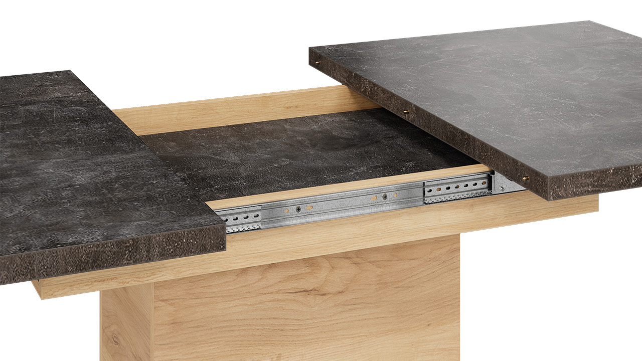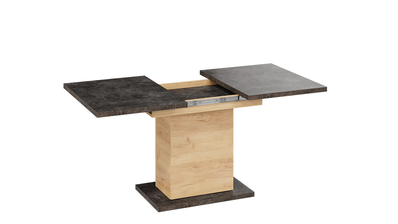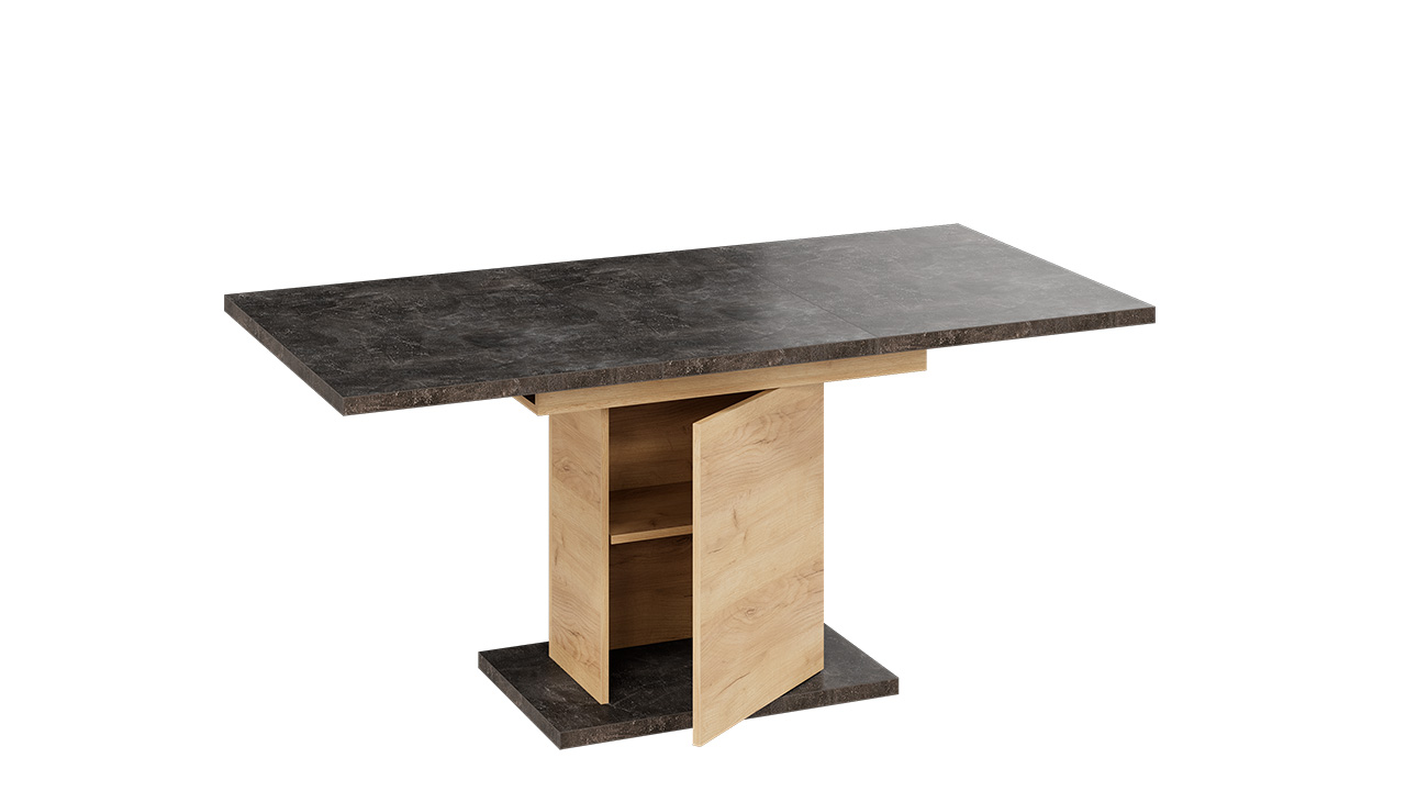 Функциональность. Стол «Детройт» Тип 4 имеет надежный ручной синхронный механизм раздвижения со вставкой, которая укладывается вручную. Это выручает в моменты прихода гостей, которых хочется разместить свободно и с комфортом. Наша новинка удивит Вас своей практичностью. Конструкция опоры этой модели предусматривает наличие ниши с полкой для хранения необходимых предметов за дверцами, открывающимися легким нажатием руки.