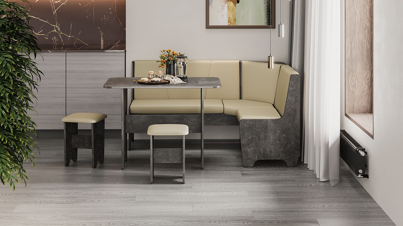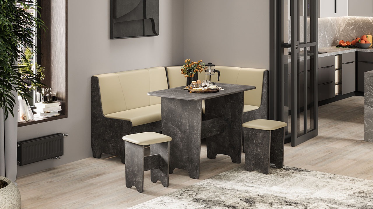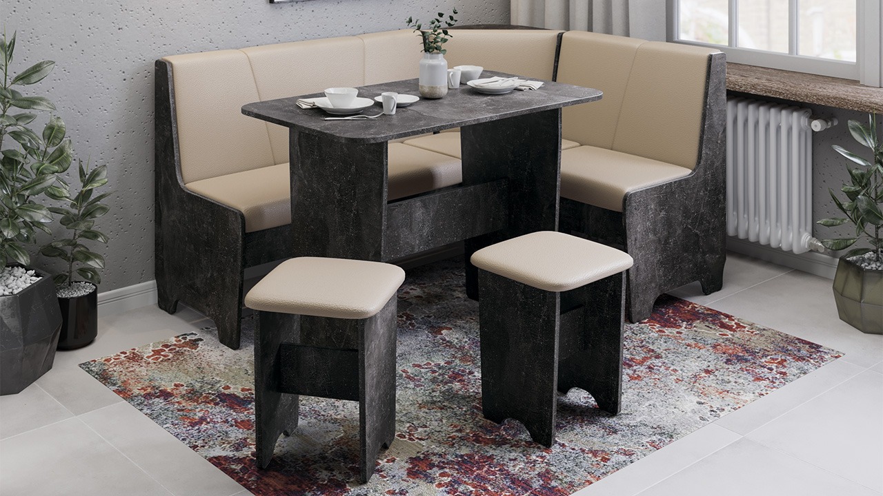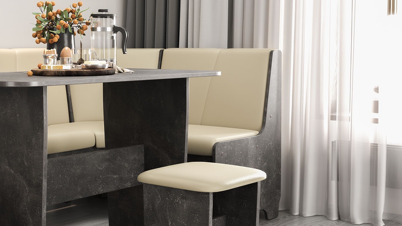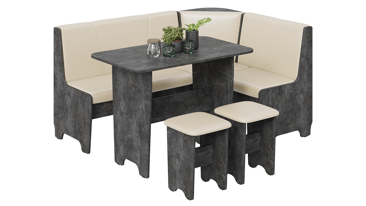 Материалы. Каркас кухонного уголка изготовлен из ЛДСП 16 мм. В обработке торцов используется кромка ПВХ. Для мягкости применяется практичный наполнитель ППУ, который имеет высокий уровень влагообмена и воздухопроницаемости. Благодаря мягкой высокой спинке и сиденью обеспечивается не только надежная поддержка спины, но и дополнительный комфорт при использовании этой мебелью. «Техас» - готовый комплект, где удачно подобраны по дизайну и габаритам стол с набором одинаковых табуретов.