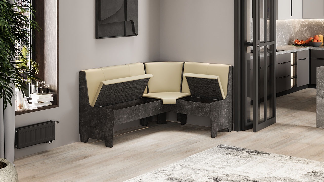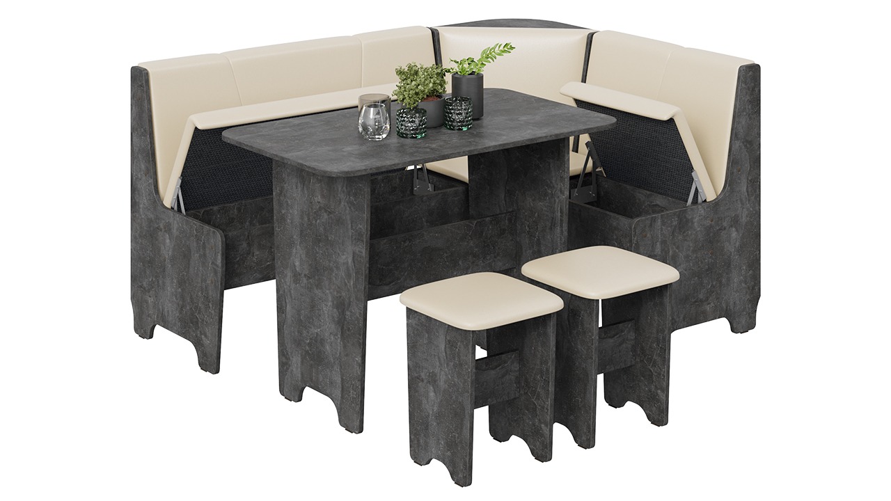 Функциональность. Скамья оснащена дополнительной полезной поверхностью в углу сверху спинки, что дает возможность разместить на виду необходимые предметы. Так же под сидениями скамьи располагаются вместительные ящики, в которых можно хранить большое количество кухонных принадлежностей.