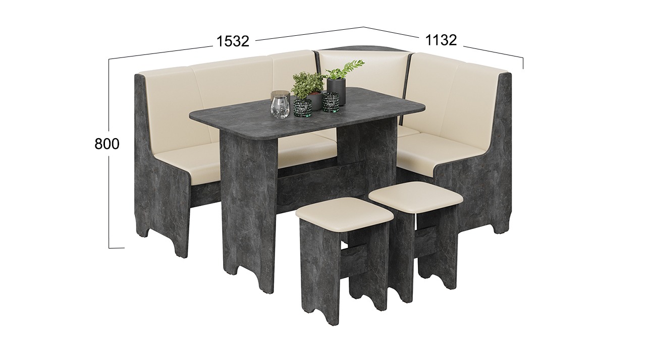 | Габаритная ширина1 132 | Размеры столаШ×Г×В: 1000×600×730 | Размеры табуретовШ×Г×В: 330×330×430 |