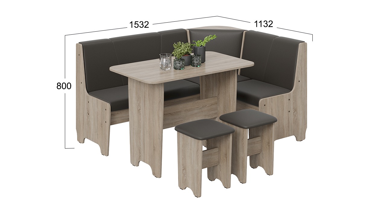 Материалы. Каркас кухонного уголка изготовлен из ЛДСП 16 мм. В обработке торцов используется кромка ПВХ. Для мягкости применяется практичный наполнитель ППУ, который имеет высокий уровень влагообмена и воздухопроницаемости. Благодаря мягкой высокой спинке и сиденью обеспечивается не только надежная поддержка спины, но и дополнительный комфорт при использовании этой мебелью. «Техас» - готовый комплект, где удачно подобраны по дизайну и габаритам стол с набором одинаковых табуретов.