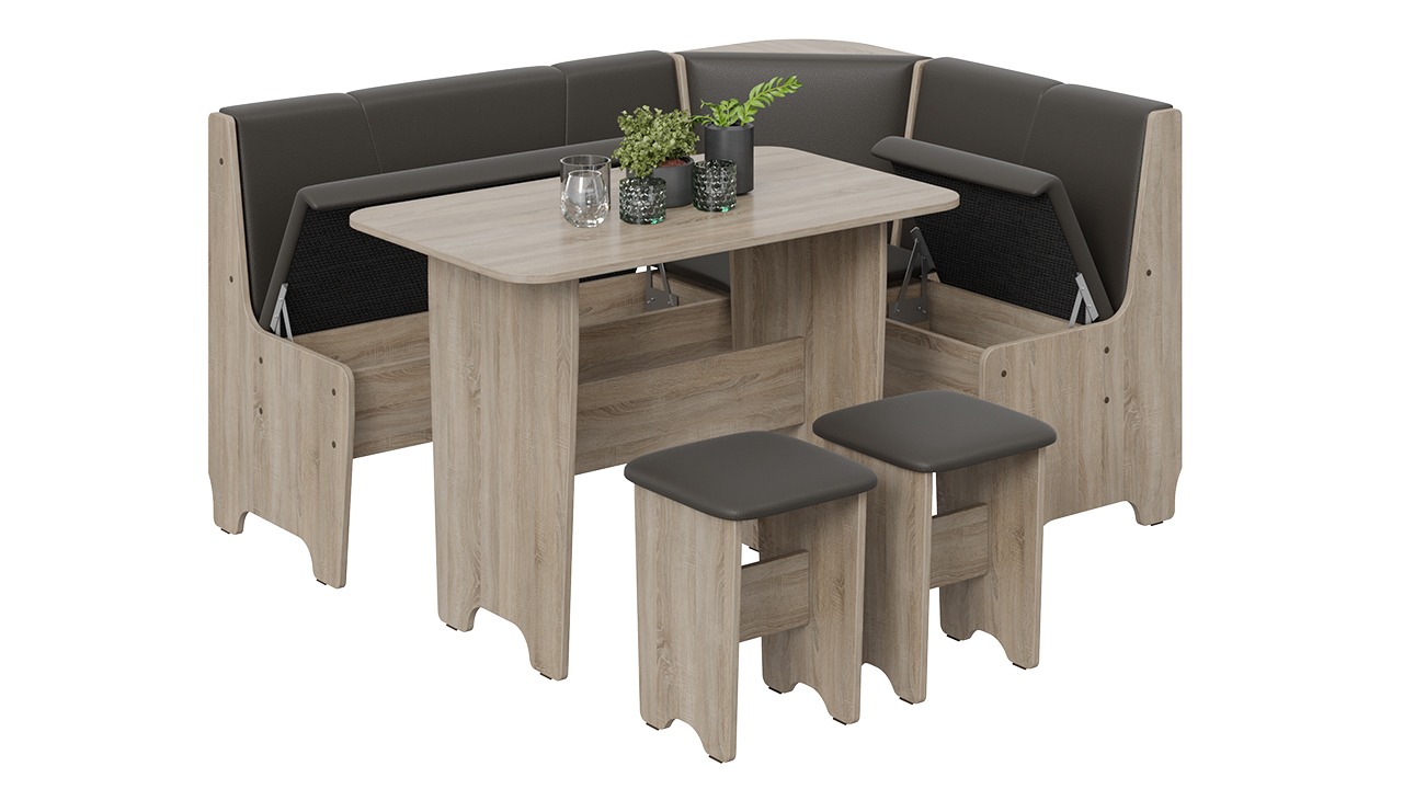 Функциональность. Скамья оснащена дополнительной полезной поверхностью в углу сверху спинки, что дает возможность разместить на виду необходимые предметы. Так же под сидениями скамьи располагаются вместительные ящики, в которых можно хранить большое количество кухонных принадлежностей.