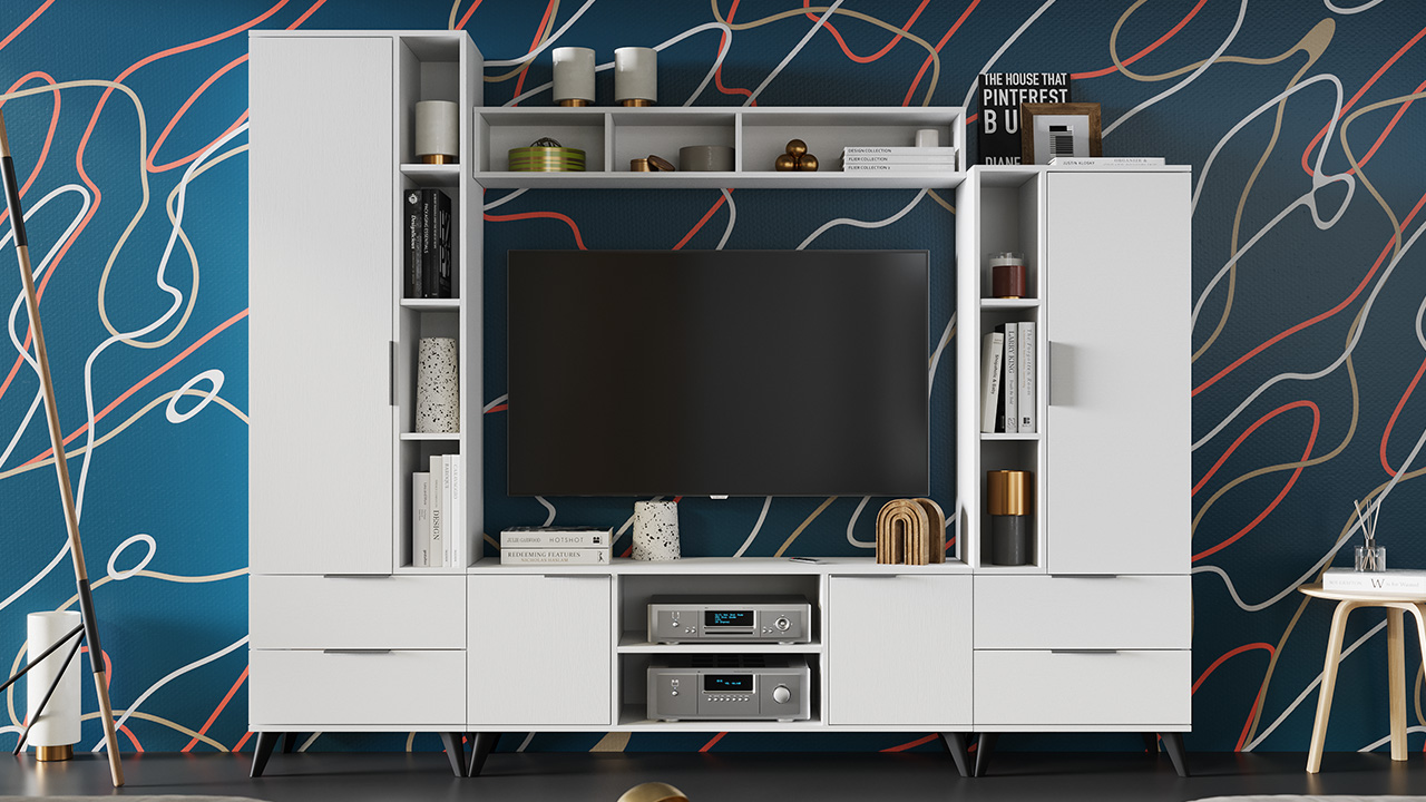 Модульность. Неоспоримое преимущество ТВ тумбы «Агата» —эргономичность, презентабельность и функциональность, которую ей гарантирует наличие открытых и закрытых ниш. Полка, расположенная в центре модели остается открытой, что делает ее подходящим решением для размещения аудио- и видеотехники, а открытые настенные полки, которые размещаются над ТВ тумбой, позволят расположить любимые элементы декора и сувениры. Подвесной шкаф и напольные шкафы разной высоты предназначены для размещения книг, посуды и других предметов.