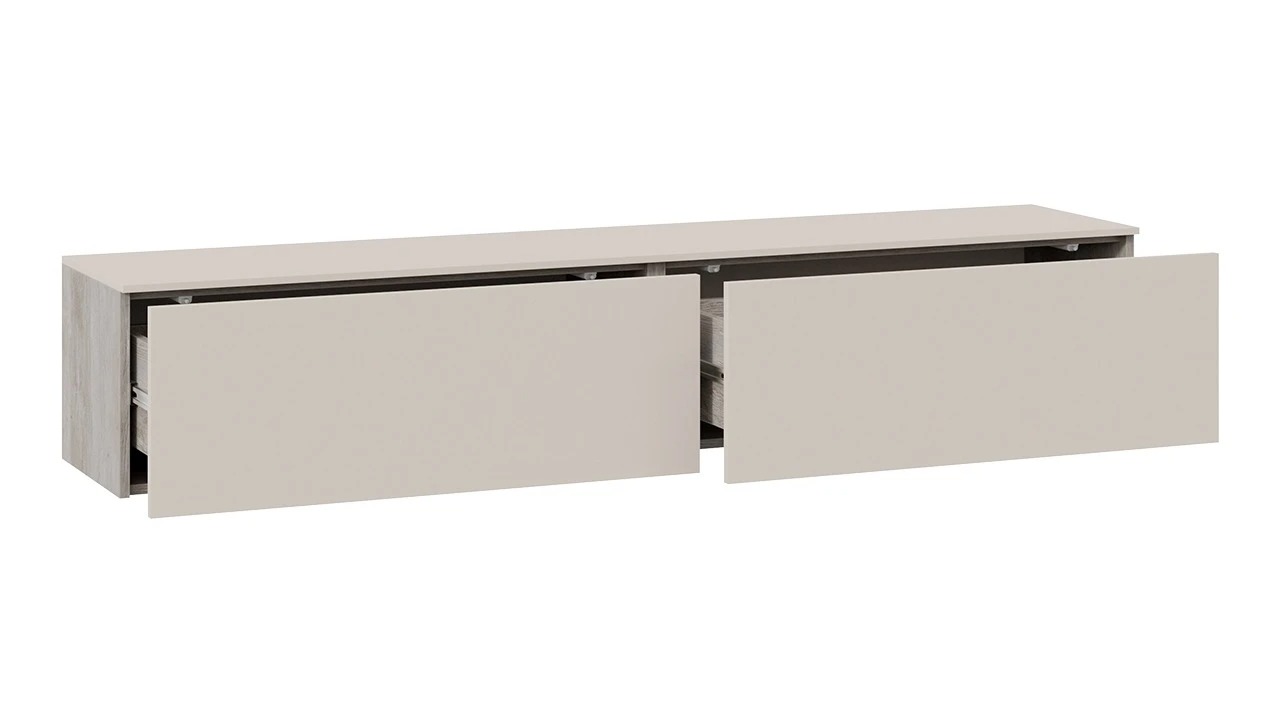 Модульность. Тумба под ТВ имеет вместительные ящики для хранения, а шариковые направляющие позволят плавно и бесшумно открывать их и закрывать. В конструкции ТВ тумбы использована комбинированная система открывания, где установлена система push-to-open и имеется возможность открывания с помощью захвата рукой снизу. Шкаф навесной также открывается с помощью захвата рукой снизу. Панель для ТВ, стеллаж навесной и металлические опоры являются универсальными модулями, которыми, при необходимости, можно дополнить композицию.