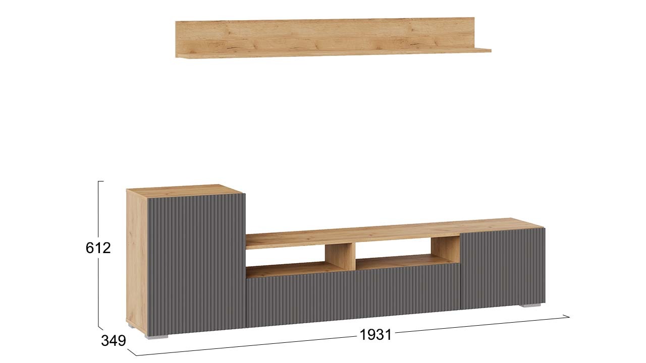 Дизайн. Гостиная представлена в трендовых декорах, что позволяет гармонично вписать его в любой интерьер, будь то классический или современный. Важной особенностью новинки является вертикальная фрезеровка на фасадах, которая дополняет стильный образ. Отличительной чертой тумбы является отсутствие лицевой фурнитуры, благодаря чему модель выглядит лаконично. За привлекательными распашными фасадами расположены вместительные ниши, что позволяет разместить необходимые предметы и аппаратуру.