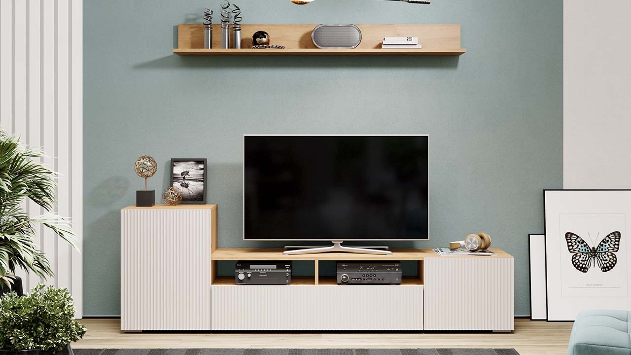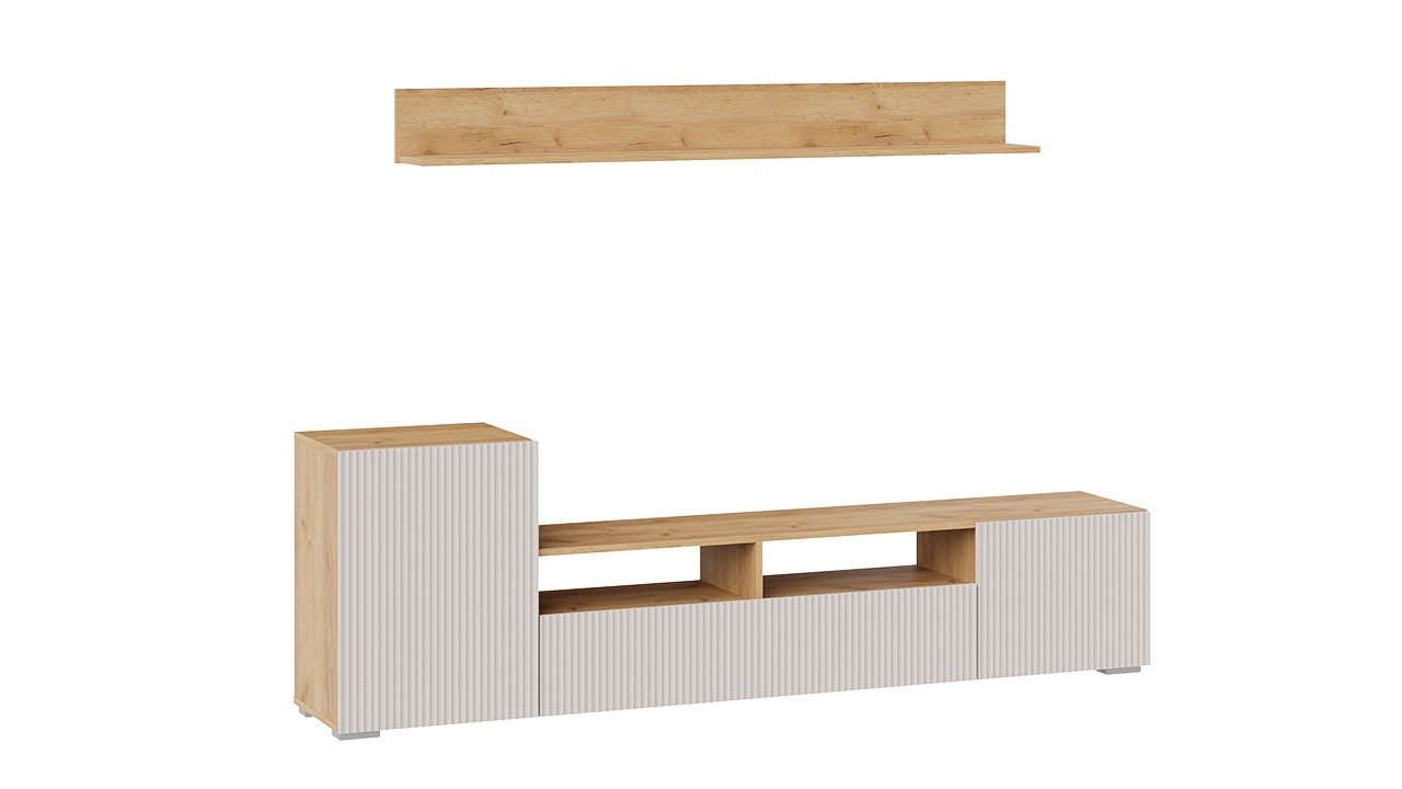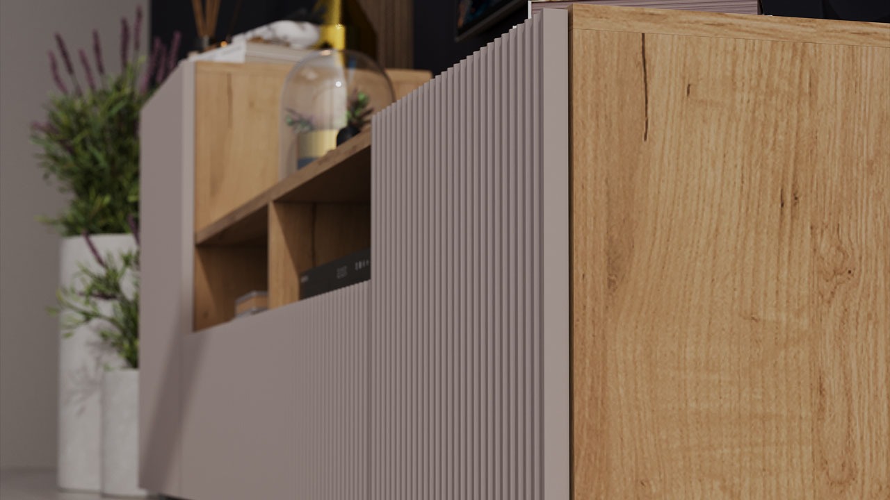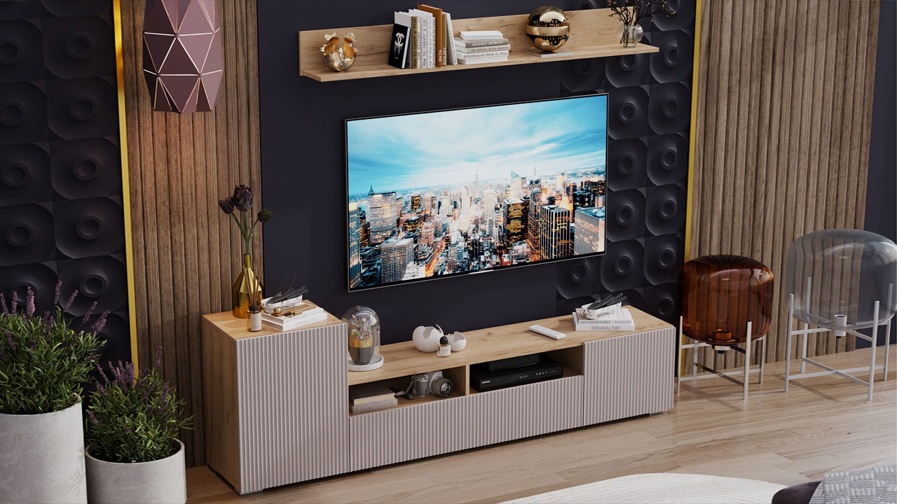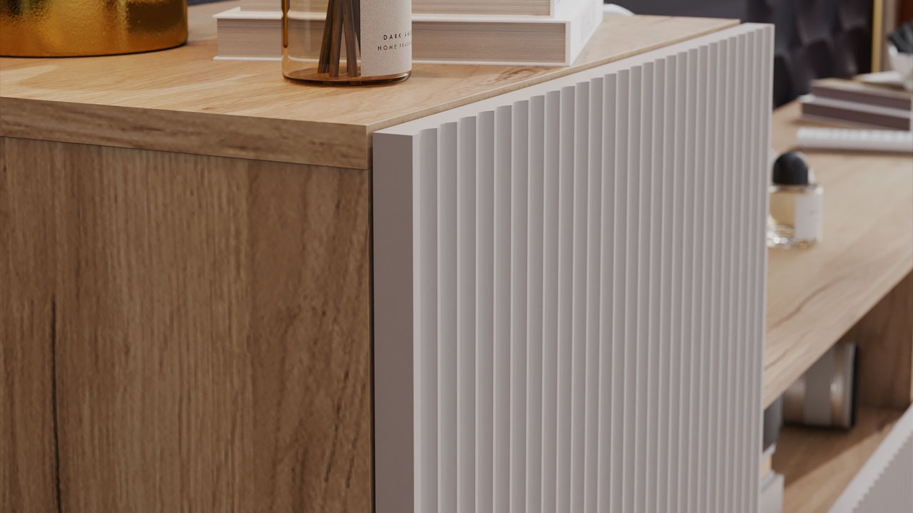 Дизайн. Гостиная представлена в трендовых декорах, что позволяет гармонично вписать его в любой интерьер, будь то классический или современный. Важной особенностью новинки является вертикальная фрезеровка на фасадах, которая дополняет стильный образ. Отличительной чертой тумбы является отсутствие лицевой фурнитуры, благодаря чему модель выглядит лаконично. За привлекательными распашными фасадами расположены вместительные ниши, что позволяет разместить необходимые предметы и аппаратуру.