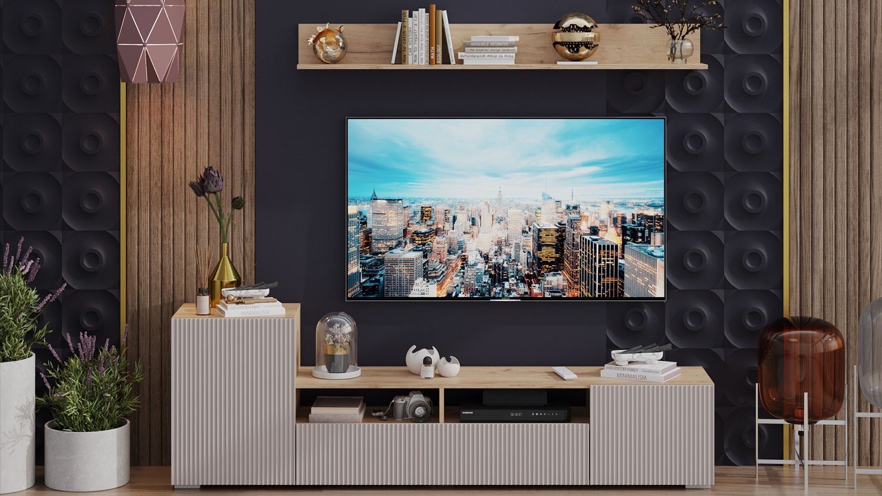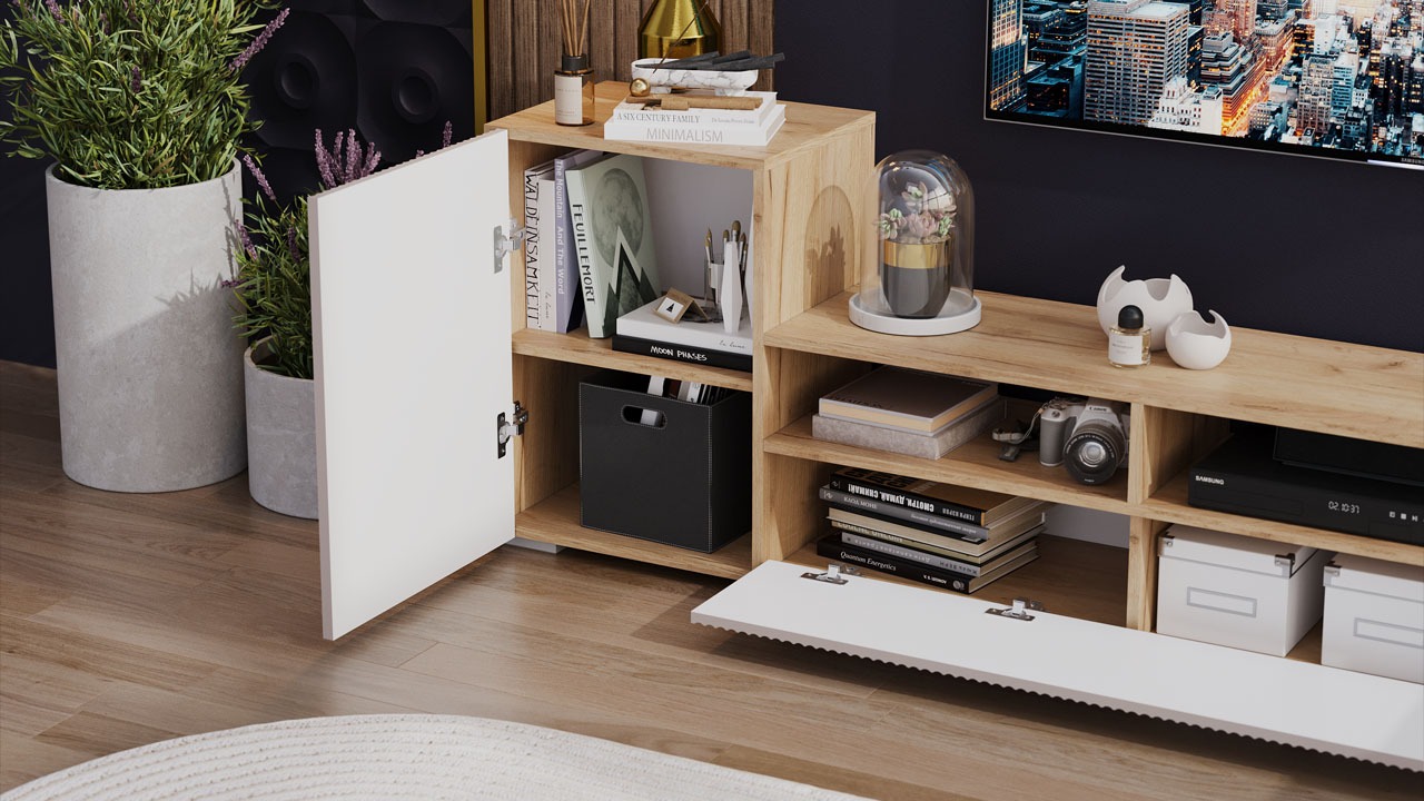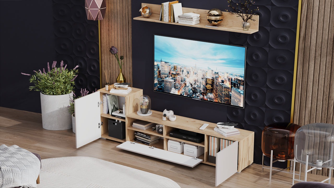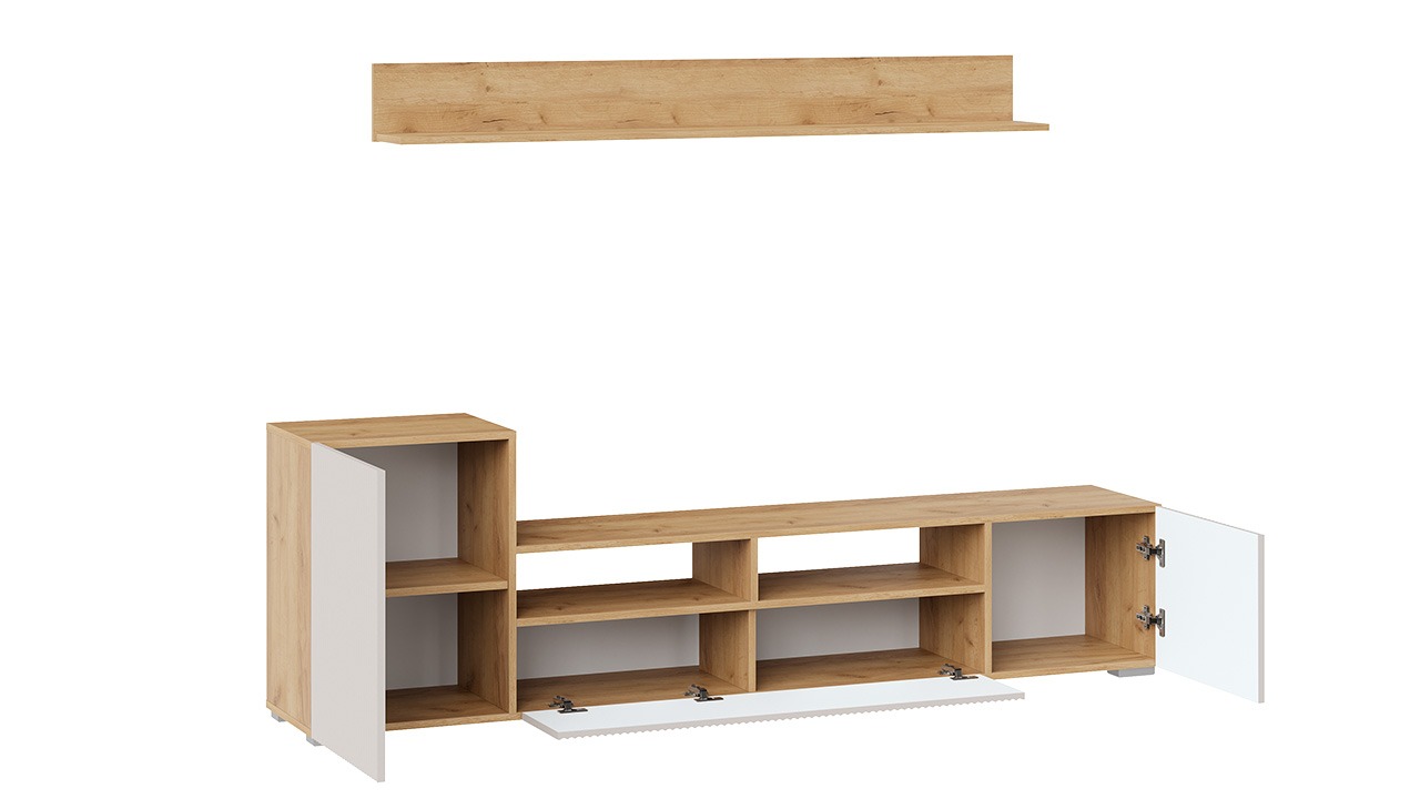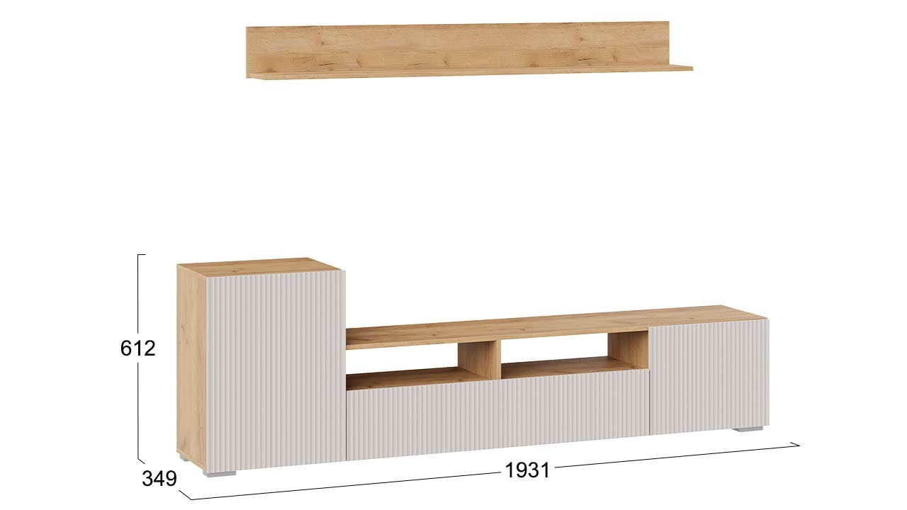 Дизайн. Гостиная представлена в трендовых декорах, что позволяет гармонично вписать его в любой интерьер, будь то классический или современный. Важной особенностью новинки является вертикальная фрезеровка на фасадах, которая дополняет стильный образ. Отличительной чертой тумбы является отсутствие лицевой фурнитуры, благодаря чему модель выглядит лаконично. За привлекательными распашными фасадами расположены вместительные ниши, что позволяет разместить необходимые предметы и аппаратуру.