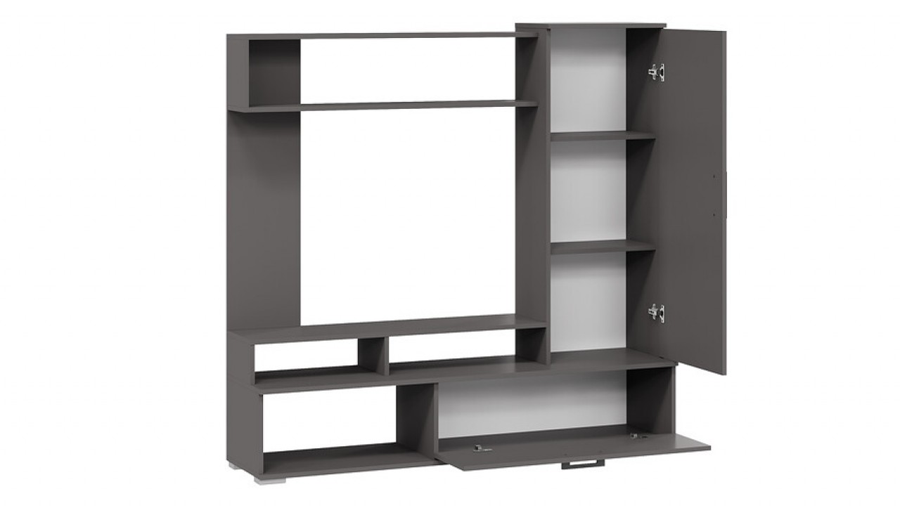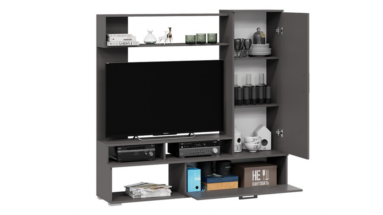Функциональность. Кроме внешнего вида «Сиена» представляет собой единый набор, имеющий в составе всё необходимое для установки и использования в гостиной. Открытые полки, для размещения книг и предметов декора, открытая и закрытая ниши под ТВ позволят хранить медийную технику и личные вещи. Продуманный дизайн, практичная фурнитура, легкость и вместительность, всем этим может похвастаться малогабаритная гостиная «Сиена».