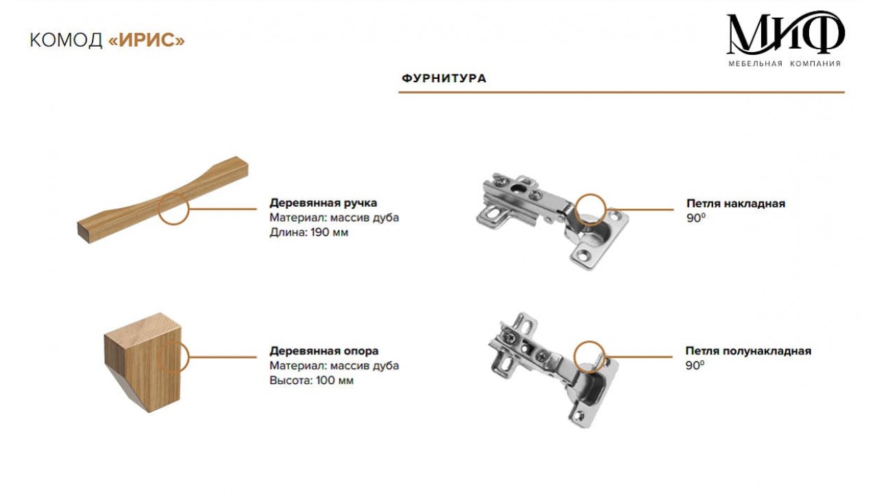 Фурнитура (ручки, направляющие для выдвижных ящиков, крепежные винты, шурупы, и т.д.).