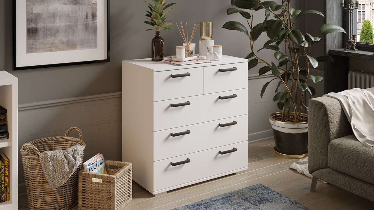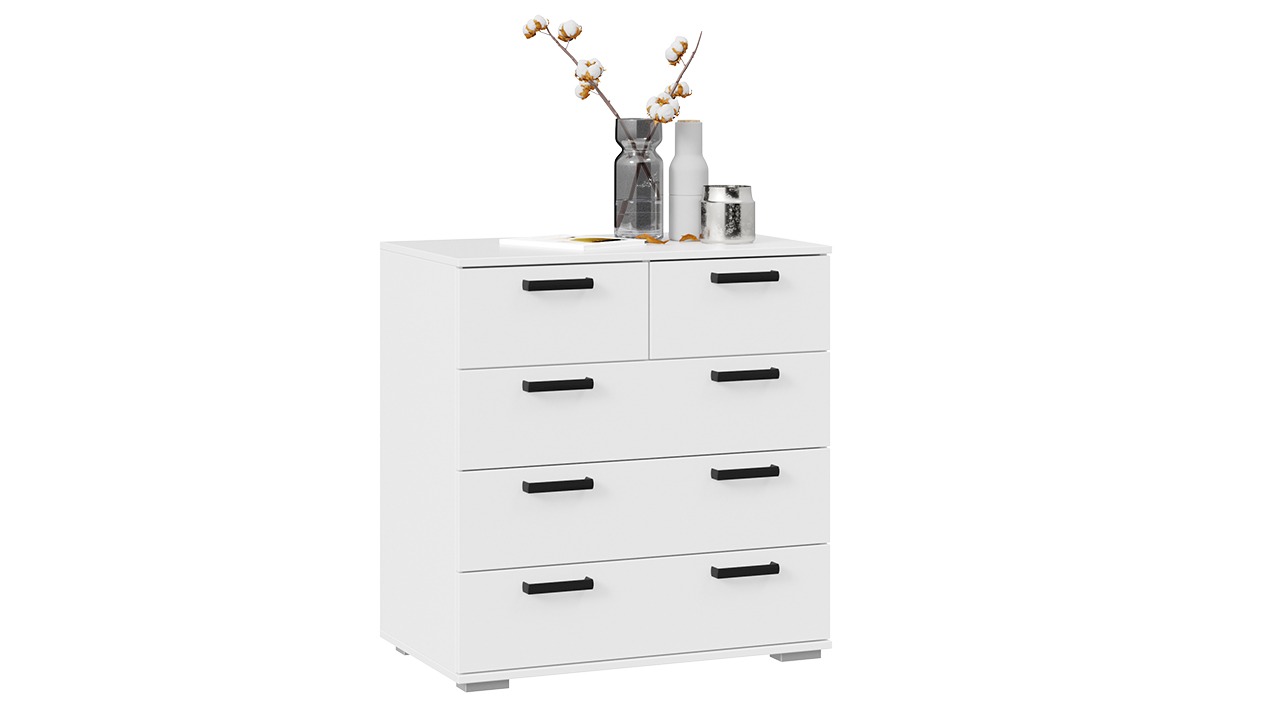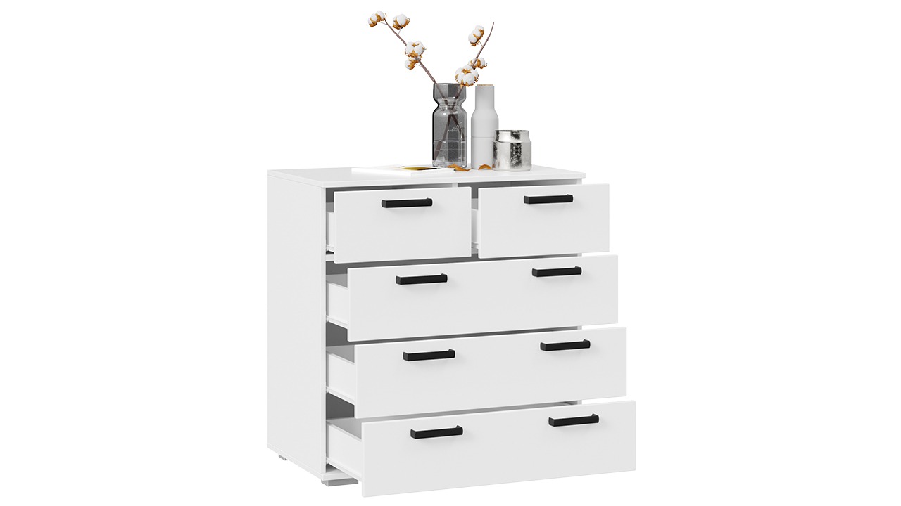 Функциональность. Комод имеет небольшие габариты и выглядит компактно, но имеет 5 вместительных выдвижных ящиков, которые позволят использовать 100% внутреннего пространства. Их можно использовать для хранения одежды, постельных принадлежностей, полотенец, а также для всевозможных мелких предметов, украшений и прочего.