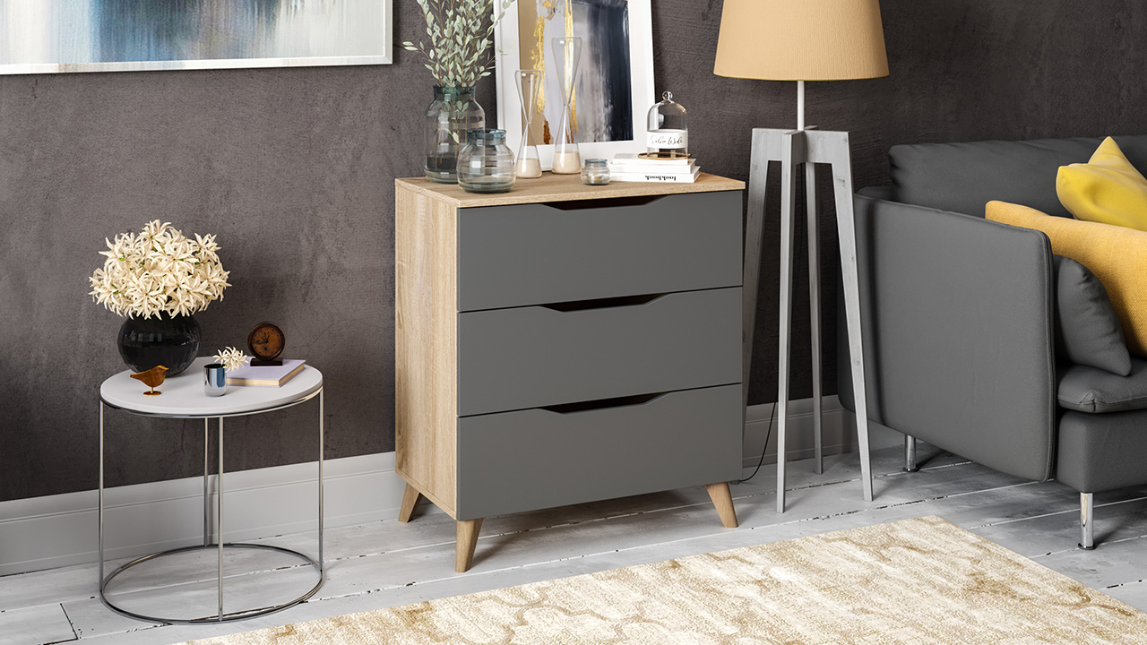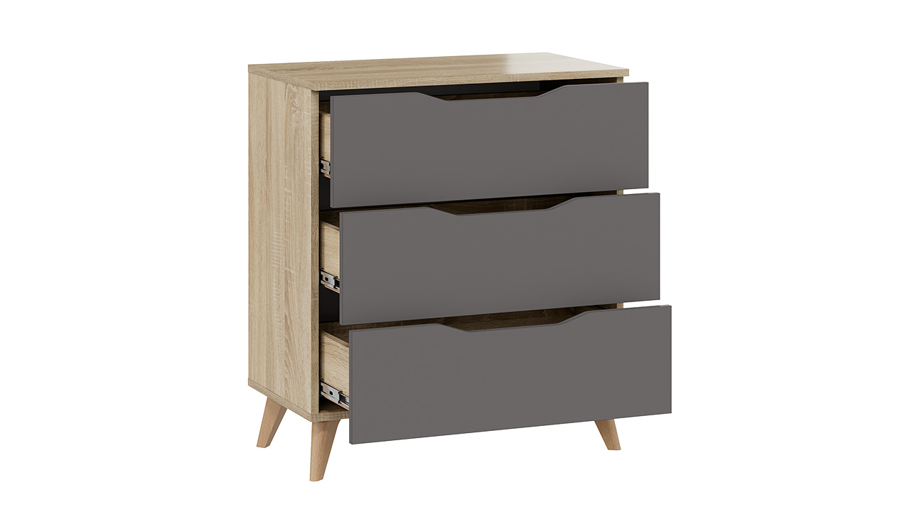 Функциональность. За счет своих размеров новинка выглядит компактно и зрительно не загромождает комнату, а благодаря выдвижным ящикам реализуется самый рациональный способ хранения предметов. Главное преимущество комода – отсутствие лицевой фурнитуры. Вырезанные отверстия в фасадах ящиков заменяют громоздкие ручки, благодаря чему модель выглядит лаконично.