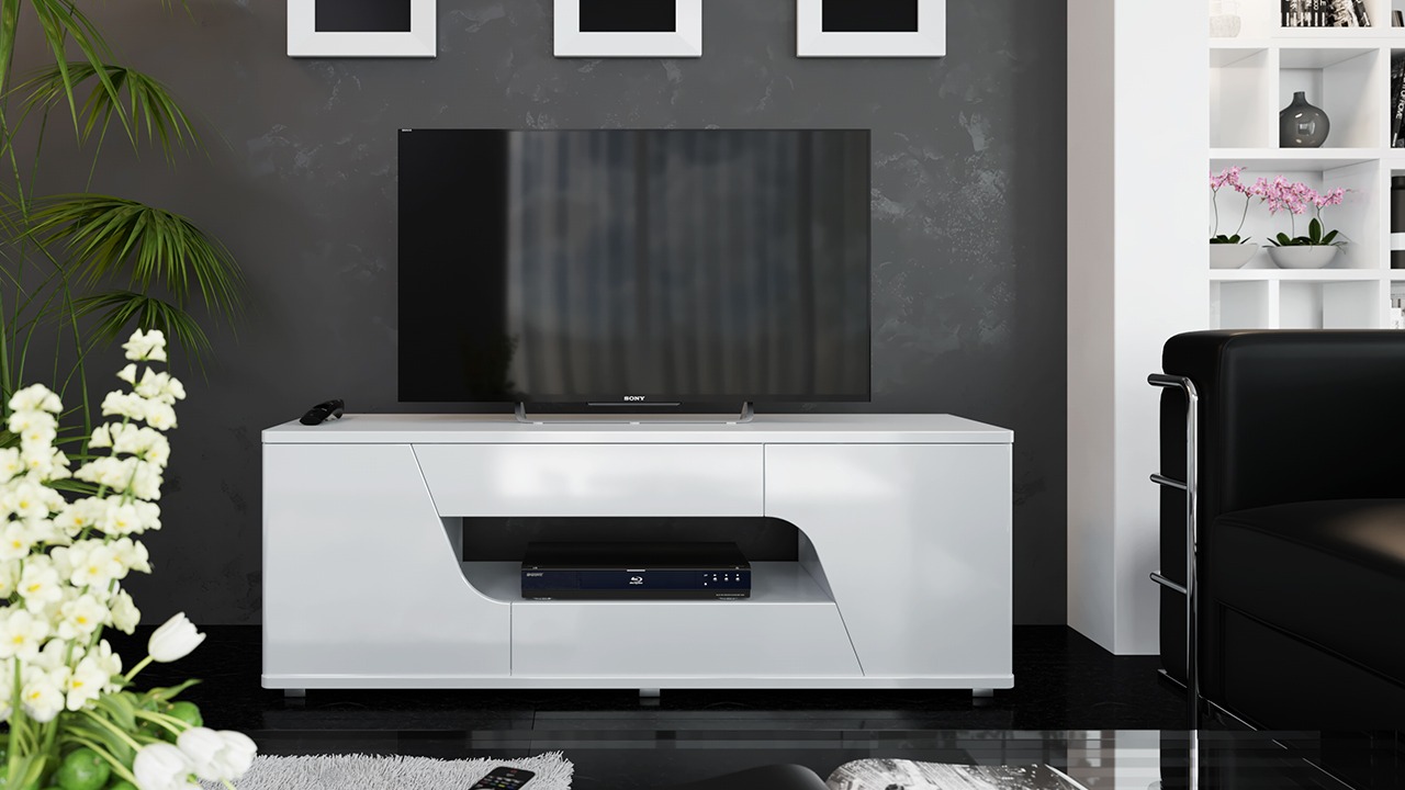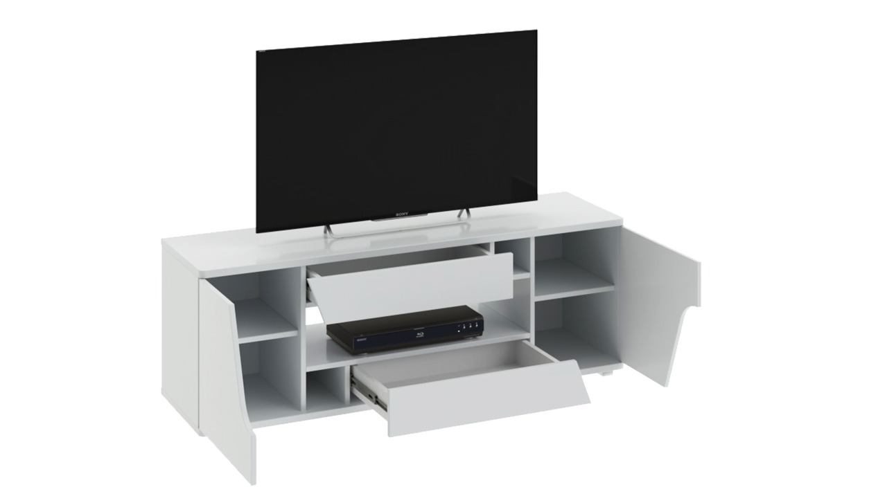 Функциональность. Тумба ТВ оснащена открытой нишей для техники, выдвижными ящиками, закрытыми секциями и широкой поверхностью подставки под телевизор. Отличительной чертой тумбы является отсутствие лицевой фурнитуры, что позволяет открывать ее с помощью захвата фасада рукой.