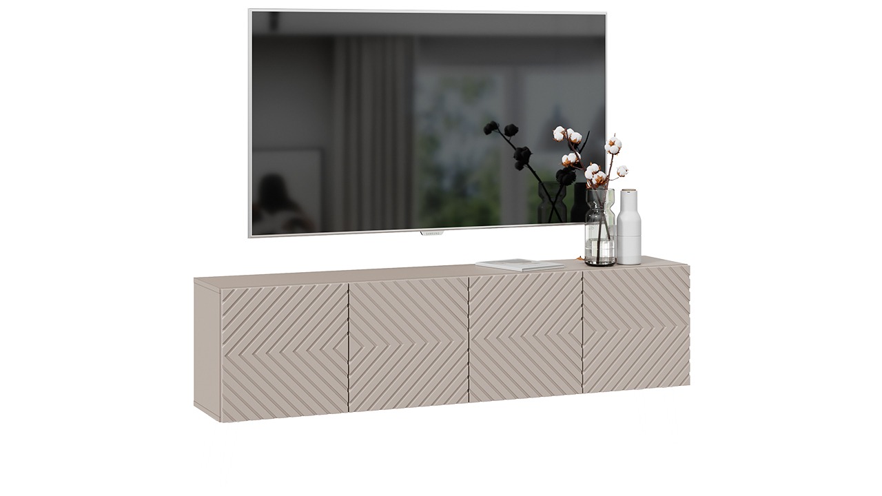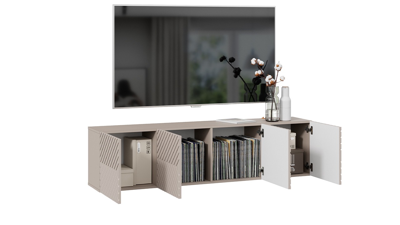Тумба под ТВ обладает геометрическим силуэтом и привлекательной цветовой палитрой, превращая новинку в стильный модуль, который прекрасно дополнит современный интерьер гостиной.