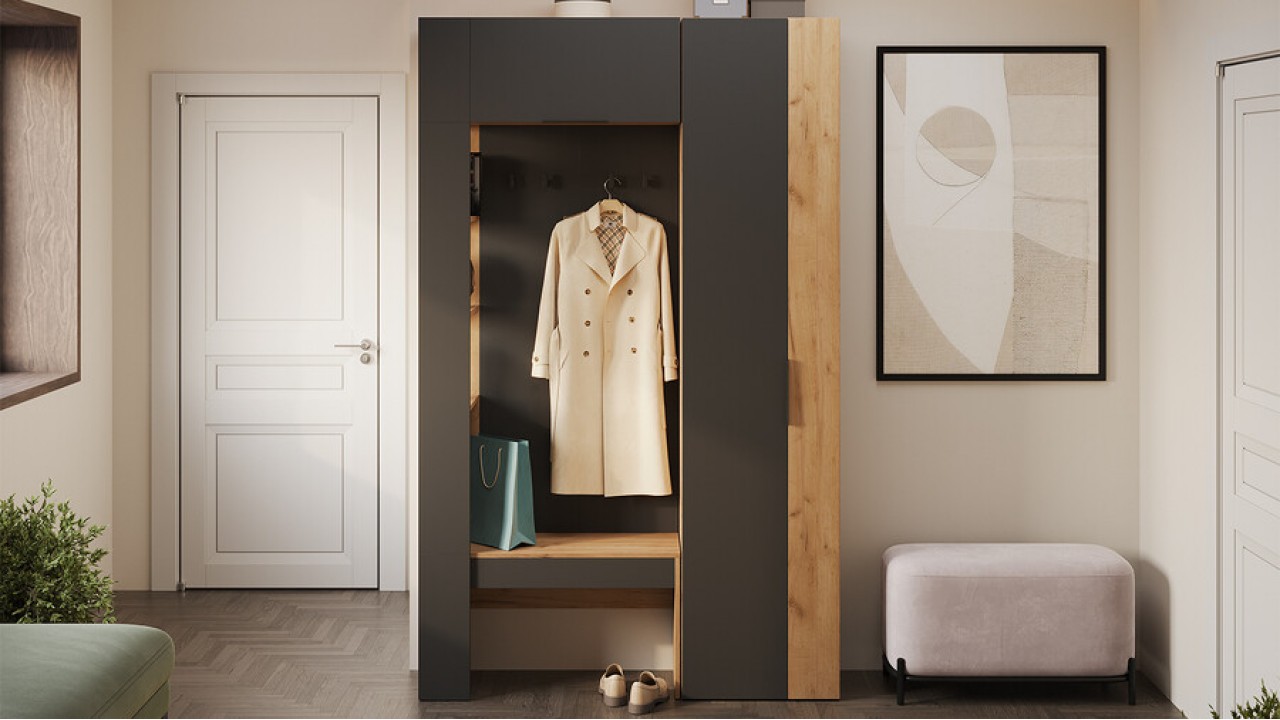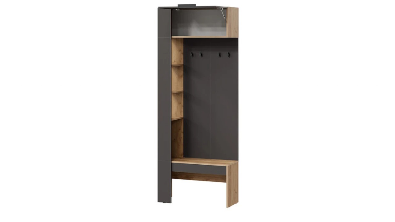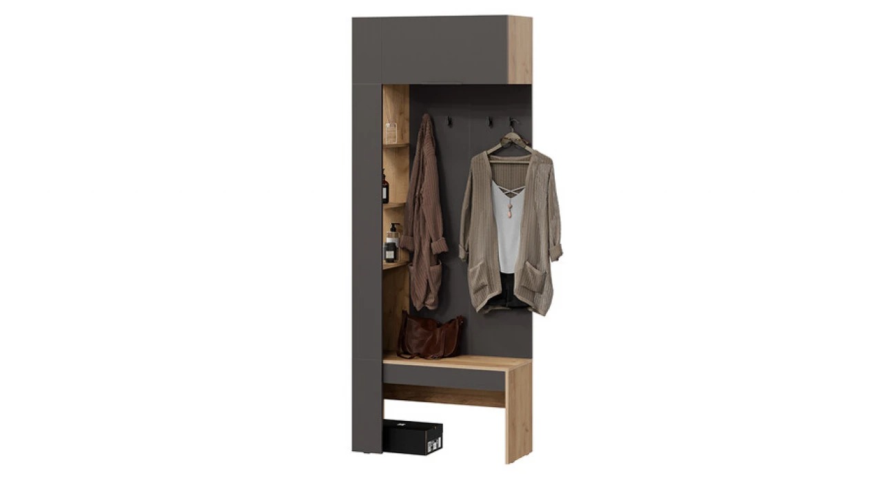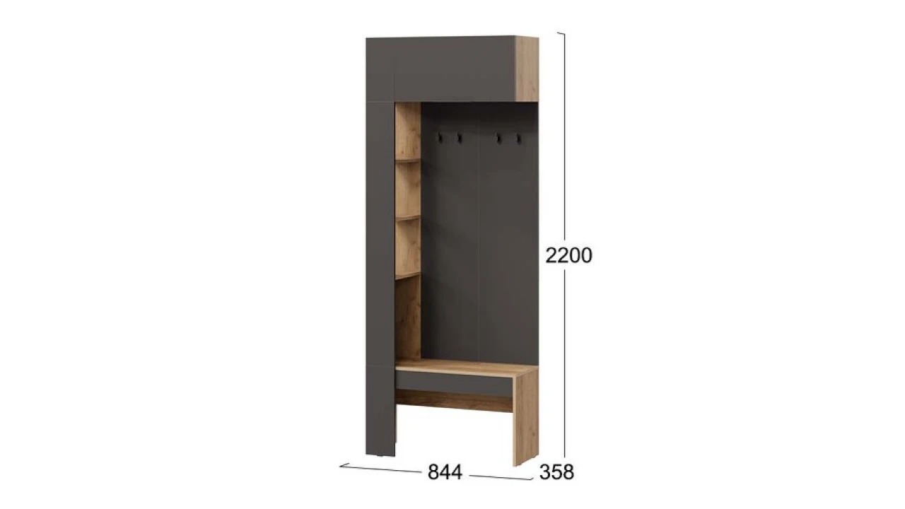 Секция комбинированная – универсальный модуль, состоящий из вместительного стеллажа для аксессуаров и закрытой верхней секции, в которой можно расположить головные уборы. Также этот модуль имеет достаточно большое открытое пространство с четырьмя крючками для верхней одежды, а в нижней части открытой секции идеально разместятся как домашние тапочки, так и более высокая обувь.
