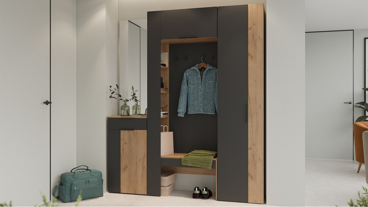 Секция комбинированная – универсальный модуль, состоящий из вместительного стеллажа для аксессуаров и закрытой верхней секции, в которой можно расположить головные уборы. Также этот модуль имеет достаточно большое открытое пространство с четырьмя крючками для верхней одежды, а в нижней части открытой секции идеально разместятся как домашние тапочки, так и более высокая обувь.