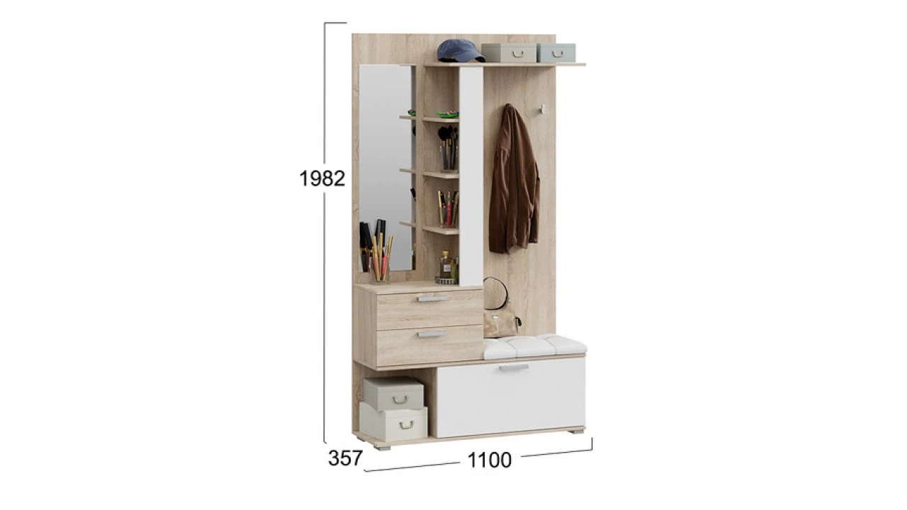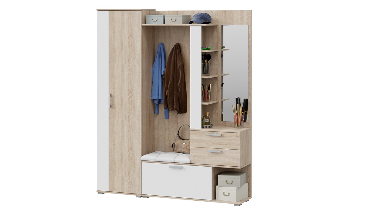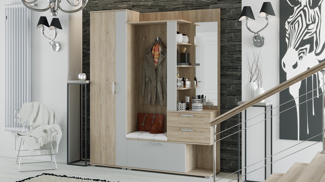 Модульность. Прихожая оснащена комбинированной вешалкой, которая включает в себя крючки для одежды в цвет лицевой фурнитуры, мягким сидением, небольшим зеркалом, закрытыми и открытыми отсеками для хранения разных предметов. На верхней полке можно расположить головные уборы, а на нижней другие необходимые аксессуары или обувь. Наличие шкафа позволит решить проблему с размещением сезонной одежды.