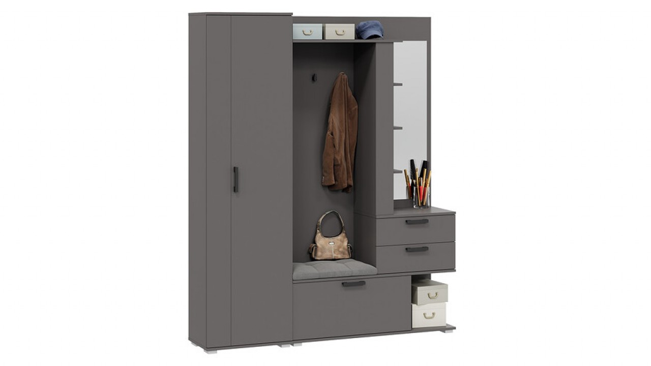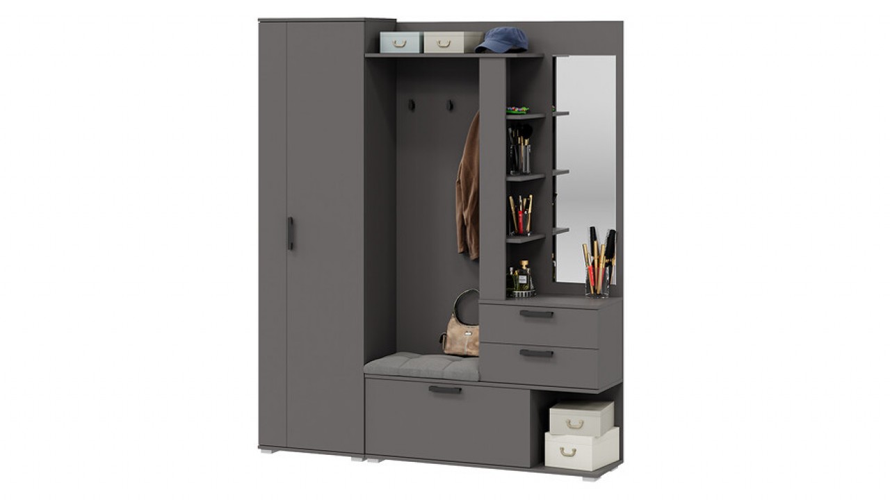 Модульность. Прихожая оснащена комбинированной вешалкой, которая включает в себя крючки для одежды в цвет лицевой фурнитуры, мягким сидением, небольшим зеркалом, закрытыми и открытыми отсеками для хранения разных предметов. На верхней полке можно расположить головные уборы, а на нижней другие необходимые аксессуары или обувь. Наличие шкафа позволит решить проблему с размещением сезонной одежды.