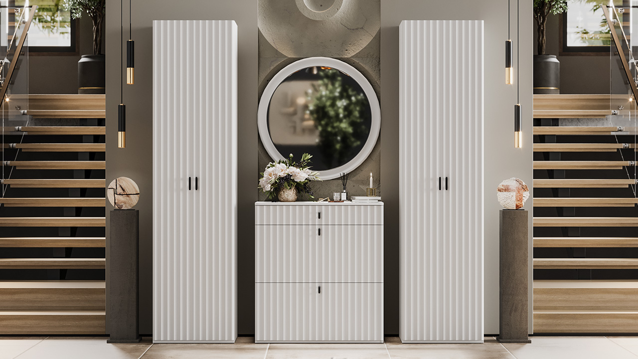 Набор мебели для прихожей Тиффани — оригинальное решение, которое органично впишется в любой современный интерьер, подчеркивая его стиль и утонченность. Дизайн. Фасады МДФ с оригинальной волнообразной фрезеровкой, придают мебели динамичность и уникальность. Специальная пленка soft-touch создает бархатистую поверхность, которая радует тактильными ощущениями при каждом взаимодействии. Удобные ручки-петельки на фасадах создают стильный вид и не перегружают образ. Элегантные линии и проработанные детали создают атмосферу изысканности, идеально соответствуя актуальным трендам в дизайне интерьеров. Фрезеровка крышек тумб имитирует фрезеровку фасадов, обеспечивая безопасность при эксплуатации благодаря отсутствию острых углов. Модульность. Прихожая состоит из модульной системы, включающей все необходимые элементы: удобные места хранения для одежды, обуви, головных уборов и других аксессуаров. Вы можете комбинировать модули прихожей, спальни и детской в различных вариантах в соответствии с вашими потребностями и предпочтениями. Функциональность. Модули прихожей изготовлены из высококачественных материалов и имеют современный дизайн, обеспечивающий удобство использования и практичность. Они могут быть выстроены в функциональные композиции, подходящие для организации вашей комнаты. Коллекция мебели «Тиффани» идеально подойдет для прихожих различных размеров и поможет эффективно организовать пространство. Каркас | Фасад: ЛДСП 16мм | МДФ 19 мм, пленка ПВХ Крышка тумбы: МДФ 19 мм, пленка ПВХ Зеркало: 4мм Обработка торцов: Кромка ПВХ 0,4 мм Направляющие: шариковые Петли: без доводчиков Максимальная нагрузка на сидение тумбы: 90кг Максимальная нагрузка на крышку тумбы: 10кг Максимальная нагрузка на полку тумбы: 3кг/5кг Максимальная нагрузка на ящик тумбы: 3кг Максимальная нагрузка на крючок вешалки: 3кг |
