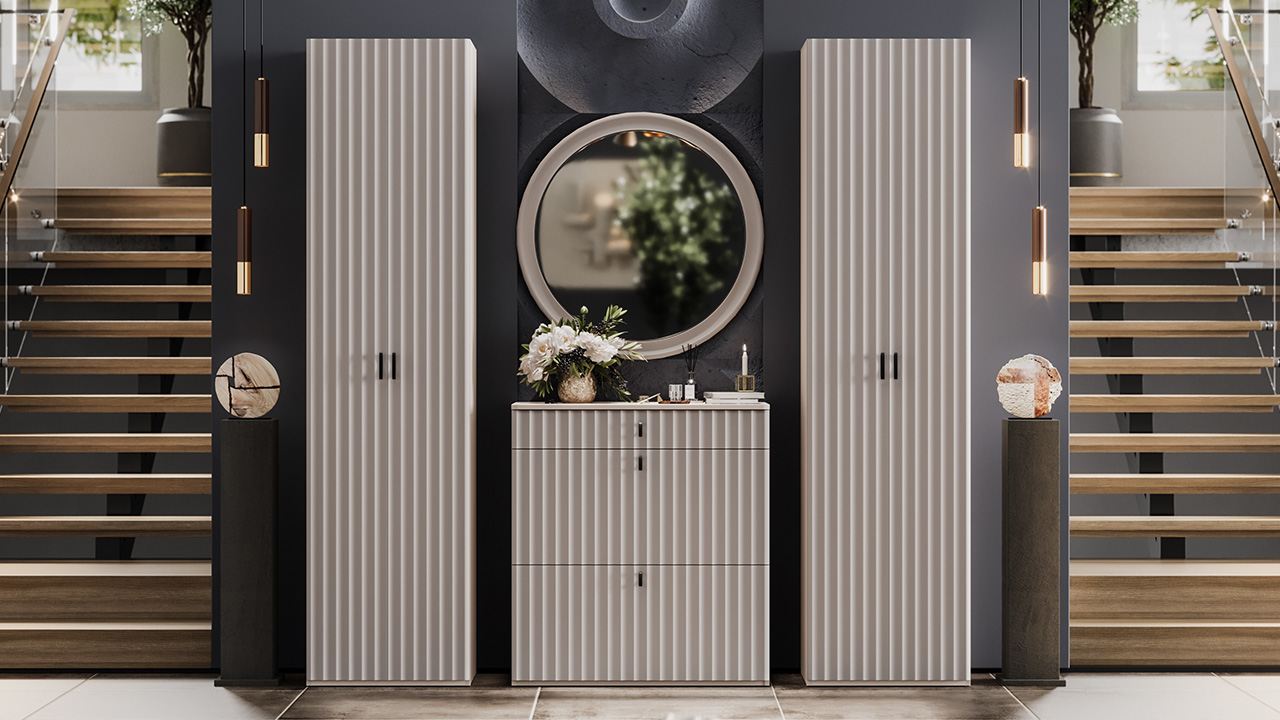 Набор мебели для прихожей Тиффани — оригинальное решение, которое органично впишется в любой современный интерьер, подчеркивая его стиль и утонченность. Дизайн. Фасады МДФ с оригинальной волнообразной фрезеровкой, придают мебели динамичность и уникальность. Специальная пленка soft-touch создает бархатистую поверхность, которая радует тактильными ощущениями при каждом взаимодействии. Удобные ручки-петельки на фасадах создают стильный вид и не перегружают образ. Элегантные линии и проработанные детали создают атмосферу изысканности, идеально соответствуя актуальным трендам в дизайне интерьеров. Фрезеровка крышек тумб имитирует фрезеровку фасадов, обеспечивая безопасность при эксплуатации благодаря отсутствию острых углов. Модульность. Прихожая состоит из модульной системы, включающей все необходимые элементы: удобные места хранения для одежды, обуви, головных уборов и других аксессуаров. Вы можете комбинировать модули прихожей, спальни и детской в различных вариантах в соответствии с вашими потребностями и предпочтениями. Функциональность. Модули прихожей изготовлены из высококачественных материалов и имеют современный дизайн, обеспечивающий удобство использования и практичность. Они могут быть выстроены в функциональные композиции, подходящие для организации вашей комнаты. Коллекция мебели «Тиффани» идеально подойдет для прихожих различных размеров и поможет эффективно организовать пространство. Каркас | Фасад: ЛДСП 16мм | МДФ 19 мм, пленка ПВХ Крышка тумбы: МДФ 19 мм, пленка ПВХ Зеркало: 4мм Обработка торцов: Кромка ПВХ 0,4 мм Направляющие: шариковые Петли: без доводчиков Максимальная нагрузка на сидение тумбы: 90кг Максимальная нагрузка на крышку тумбы: 10кг Максимальная нагрузка на полку тумбы: 3кг/5кг Максимальная нагрузка на ящик тумбы: 3кг Максимальная нагрузка на крючок вешалки: 3кг |