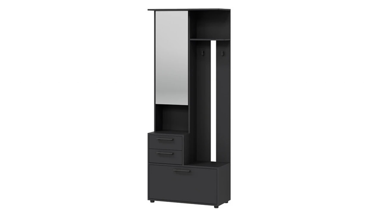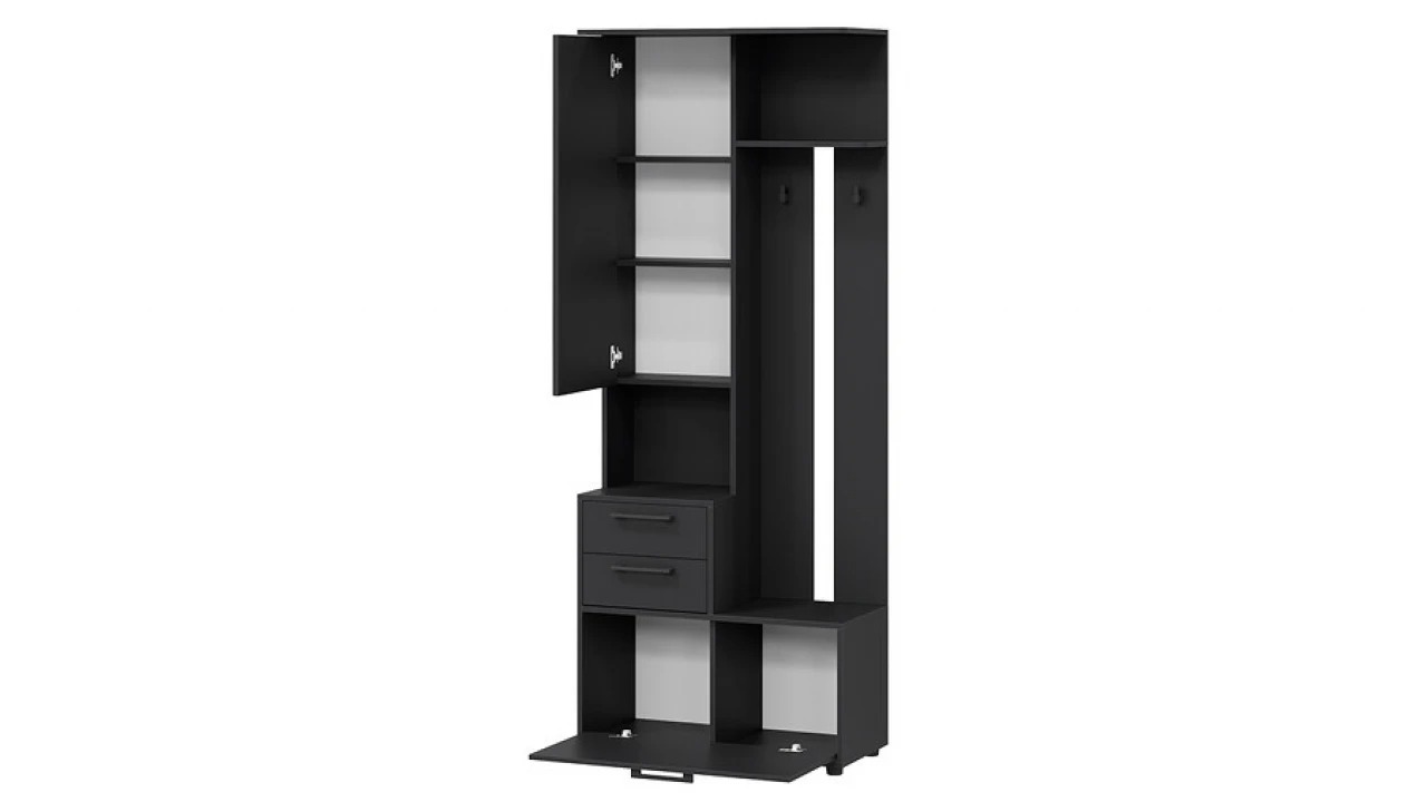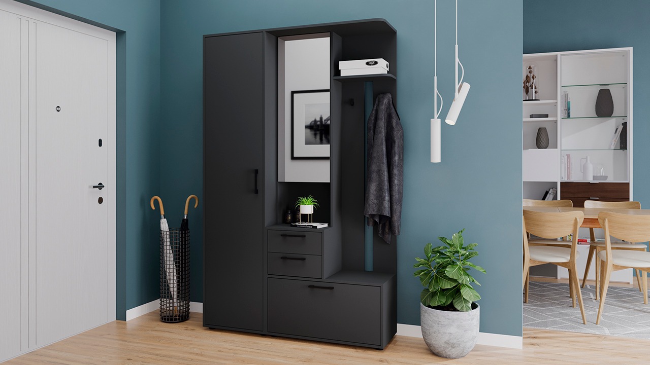 Функциональность. При своей небольшой глубине прихожая «Витра» является функциональной мебелью, ведь в её конструкции предусмотрен не только закрытый шкаф с выдвижной штангой, но и открытая секция с крючками, выдвижные ящики и закрытые ниши, в которых можно спрятать от посторонних глаз все необходимые предметы.