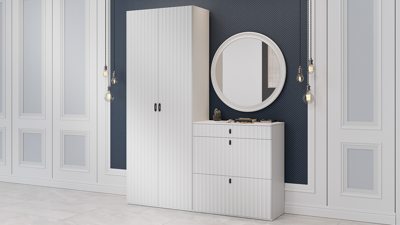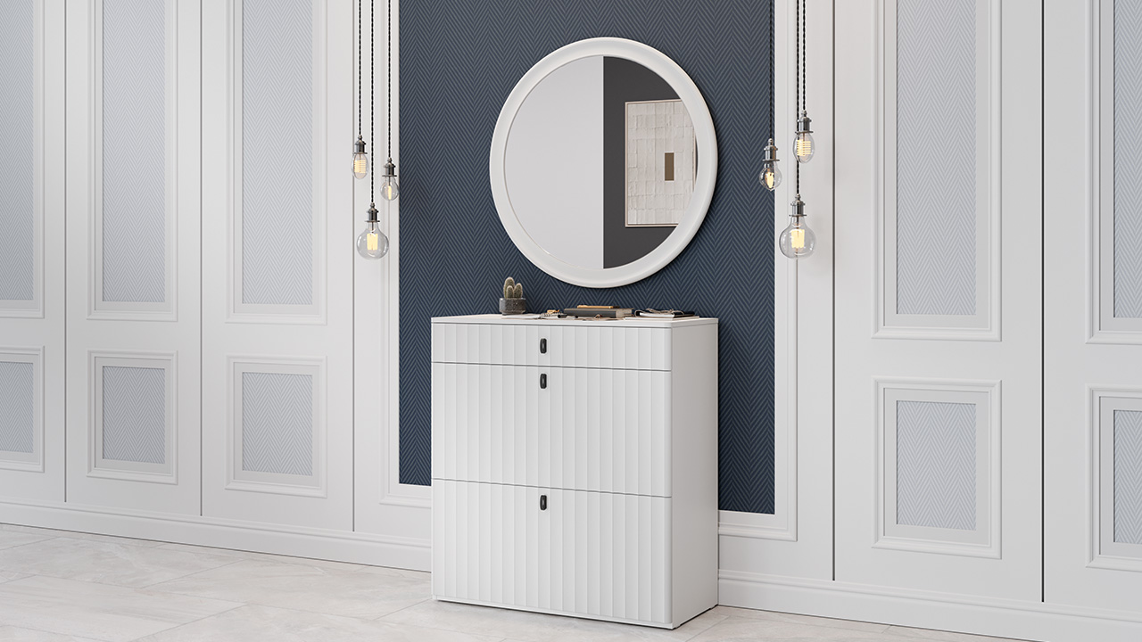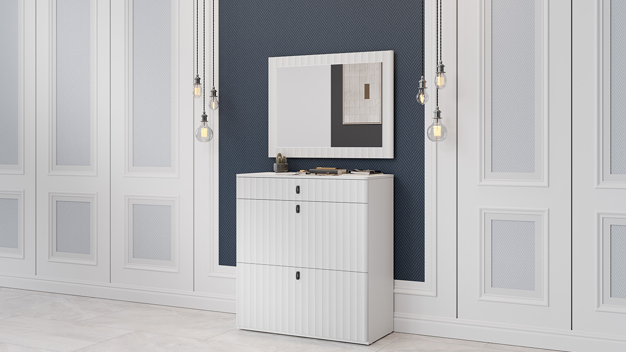 Набор мебели для прихожей Тиффани — оригинальное решение, которое органично впишется в любой современный интерьер, подчеркивая его стиль и утонченность. Дизайн. Фасады МДФ с оригинальной волнообразной фрезеровкой, придают мебели динамичность и уникальность. Специальная пленка soft-touch создает бархатистую поверхность, которая радует тактильными ощущениями при каждом взаимодействии. Удобные ручки-петельки на фасадах создают стильный вид и не перегружают образ. Элегантные линии и проработанные детали создают атмосферу изысканности, идеально соответствуя актуальным трендам в дизайне интерьеров. Фрезеровка крышек тумб имитирует фрезеровку фасадов, обеспечивая безопасность при эксплуатации благодаря отсутствию острых углов. Модульность. Прихожая состоит из модульной системы, включающей все необходимые элементы: удобные места хранения для одежды, обуви, головных уборов и других аксессуаров. Вы можете комбинировать модули прихожей, спальни и детской в различных вариантах в соответствии с вашими потребностями и предпочтениями. Функциональность. Модули прихожей изготовлены из высококачественных материалов и имеют современный дизайн, обеспечивающий удобство использования и практичность. Они могут быть выстроены в функциональные композиции, подходящие для организации вашей комнаты. Коллекция мебели «Тиффани» идеально подойдет для прихожих различных размеров и поможет эффективно организовать пространство. Каркас | Фасад: ЛДСП 16мм | МДФ 19 мм, пленка ПВХ Крышка тумбы: МДФ 19 мм, пленка ПВХ Зеркало: 4мм Обработка торцов: Кромка ПВХ 0,4 мм Направляющие: шариковые Петли: без доводчиков Максимальная нагрузка на сидение тумбы: 90кг Максимальная нагрузка на крышку тумбы: 10кг Максимальная нагрузка на полку тумбы: 3кг/5кг Максимальная нагрузка на ящик тумбы: 3кг Максимальная нагрузка на крючок вешалки: 3кг |