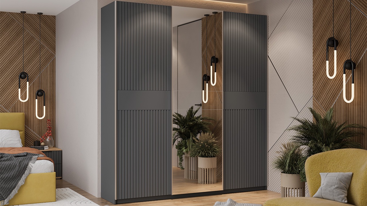 | Тип фасадаГлухой/Зеркало/Глухой | Цвет ручкиСеребро | Цвет фасадаГрафит матовый |