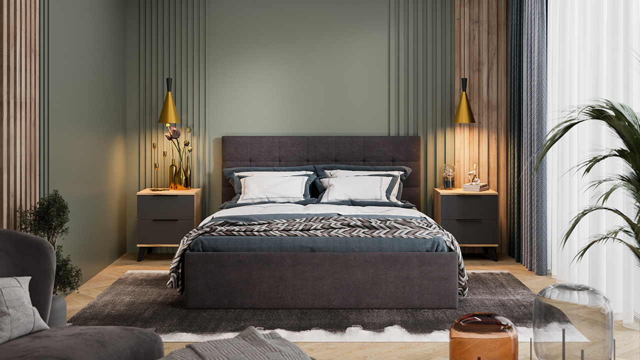| Материал фасадаЛДСП, стекло | Обивочный материалВелюр | Обивочный материал (изголовье)Велюр |
