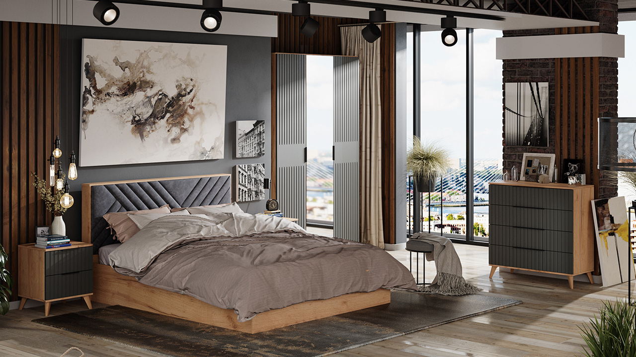 Модульность. Коллекция содержит в себе грамотно подобранные модули, которые помогут создать свой неповторимый интерьер: тумба прикроватная и комод с выдвижными ящиками, вместительный 3х створчатый шкаф с металлической штангой и полками. Стильным акцентом набора является кровать. Каркас кровати в сочетании с изысканным мягким изголовьем не будет отвлекать, а наоборот, поможет найти гармонию в привычном.