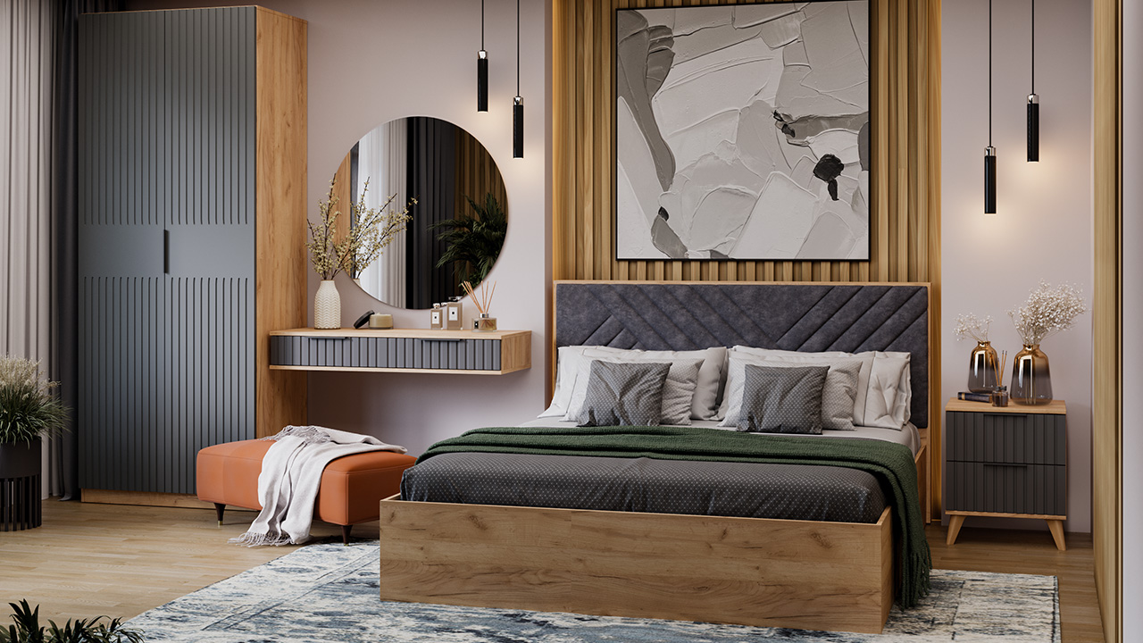 Модульность. Коллекция содержит в себе грамотно подобранные модули, которые помогут создать свой неповторимый интерьер: тумба прикроватная и комод с выдвижными ящиками, вместительный 3х створчатый шкаф с металлической штангой и полками. Стильным акцентом набора является кровать. Каркас кровати в сочетании с изысканным мягким изголовьем не будет отвлекать, а наоборот, поможет найти гармонию в привычном.