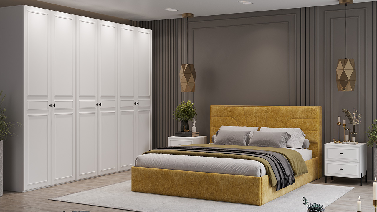 Модульность. Коллекция «Пандора» включает в себя кровать, прикроватную тумбу, комод с выдвижными ящиками и вместительные шкафы: трехстворчатый шкаф с металлической штангой и полками, шкаф для одежды и шкаф для белья, которые позволят создать дополнительное и удобное место для хранения.
