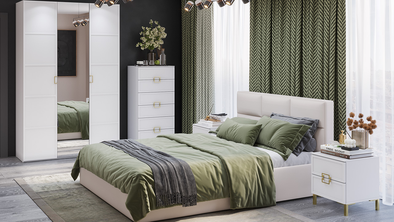 Модульность. Коллекция содержит в себе грамотно подобранные модули, которые помогут создать уникальный и неповторимый дизайн интерьера. В этой коллекции есть прикроватная тумба, комод с 6-ю выдвижными ящиками и вместительные шкафы: трехстворчатый шкаф с металлической штангой и полками, шкаф для одежды, шкаф для белья и угловой шкаф. Вместительная шкафная группа позволит оптимально организовать хранение, а продуманные габариты тумбы и комода дают возможность собрать различные компоновки.