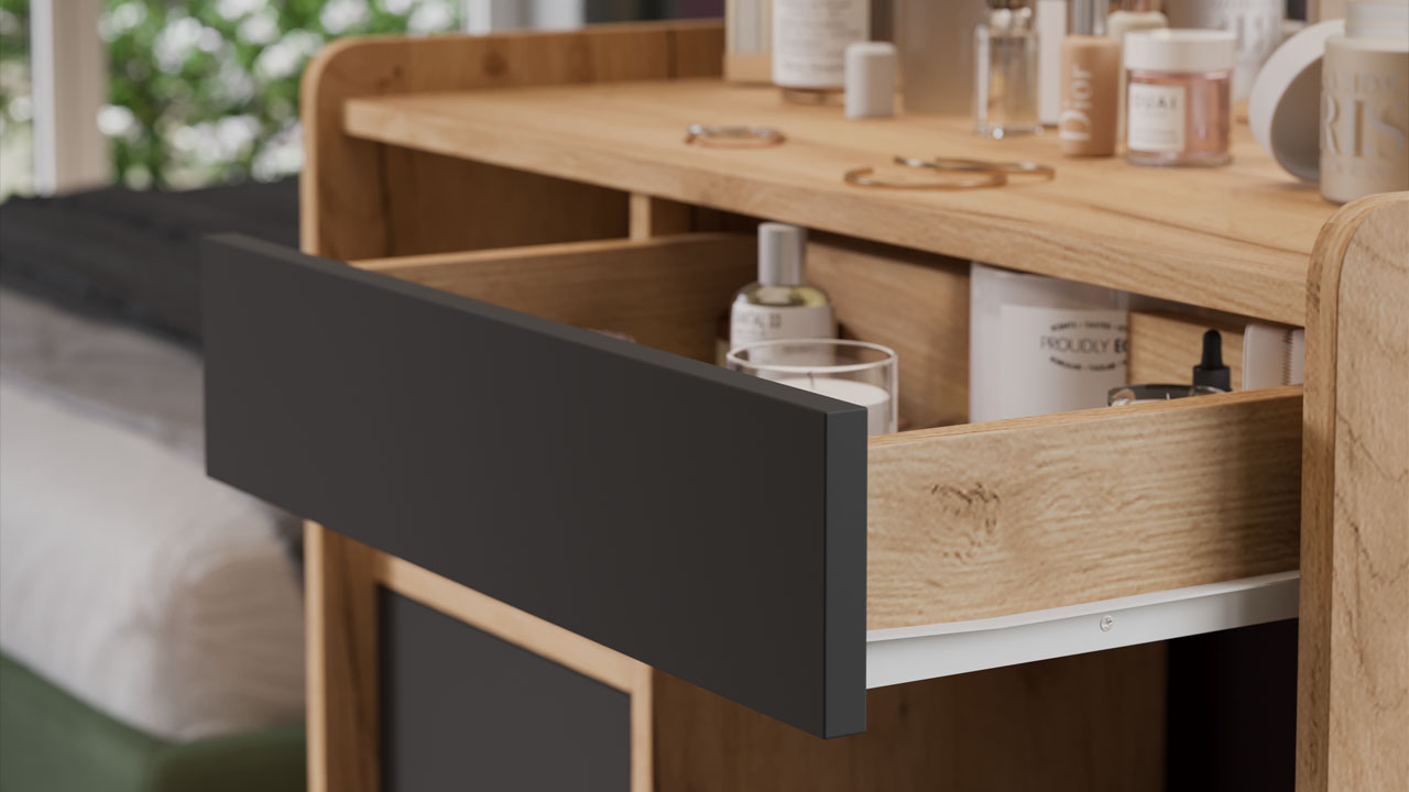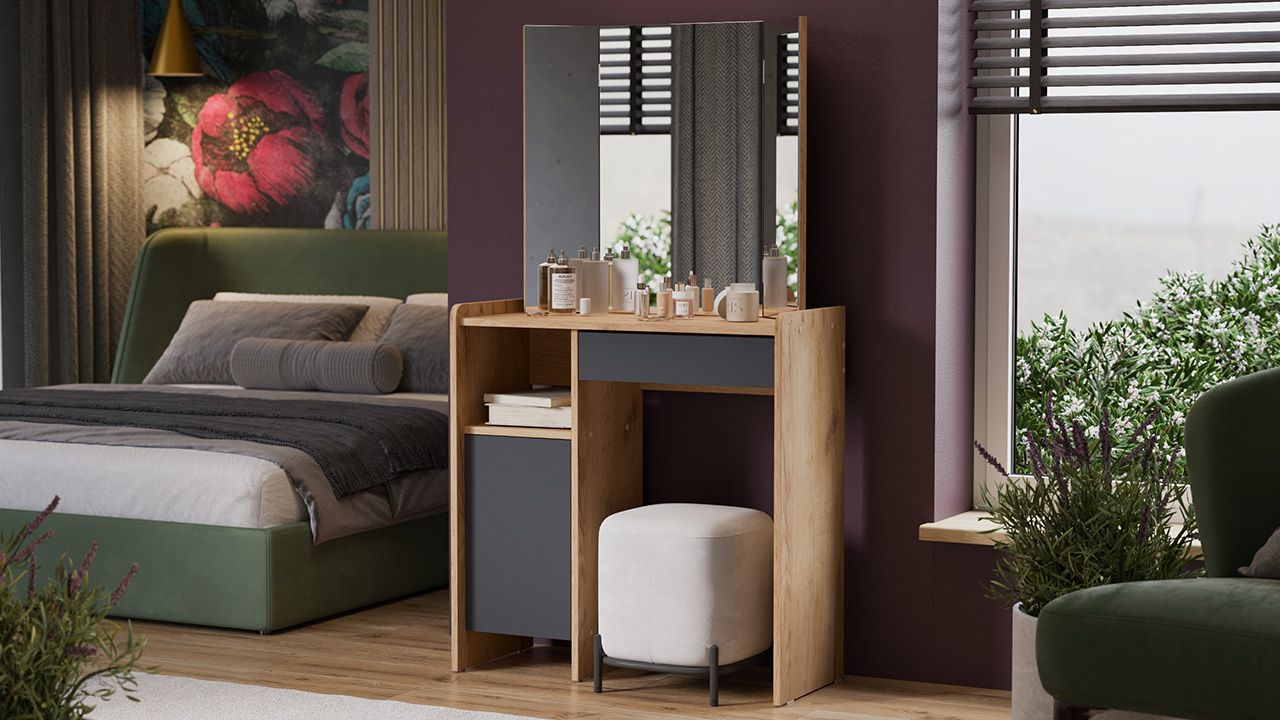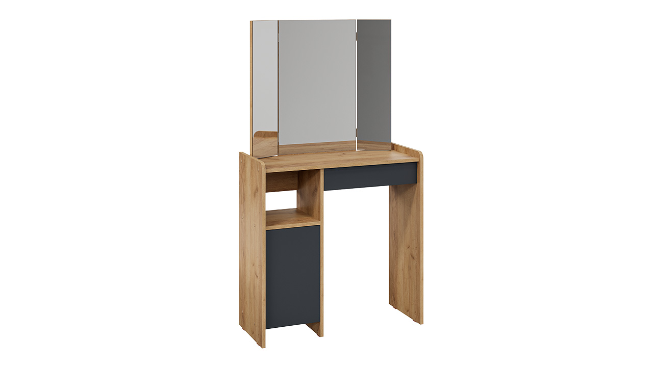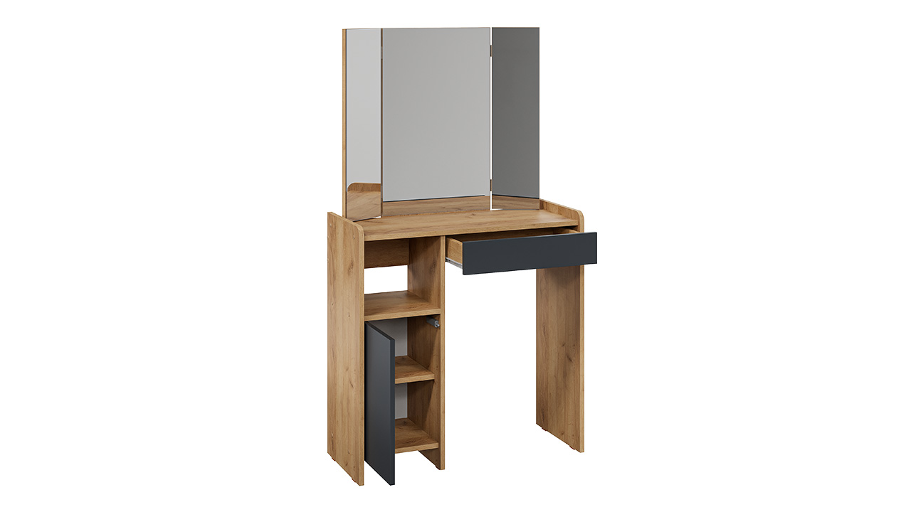Функциональность. Помимо внешней привлекательности столы оборудованы зеркалами с подвижными створками, вместительной столешницей, под которой находится выдвигающийся ящик, открытой зоной для размещения нужных предметов и закрытой секцией с дверью, куда удобно складывать всю необходимую косметику и аксессуары. Эти удобные отделения помогают поддерживать порядок и комфорт в вашем личном пространстве для красоты.