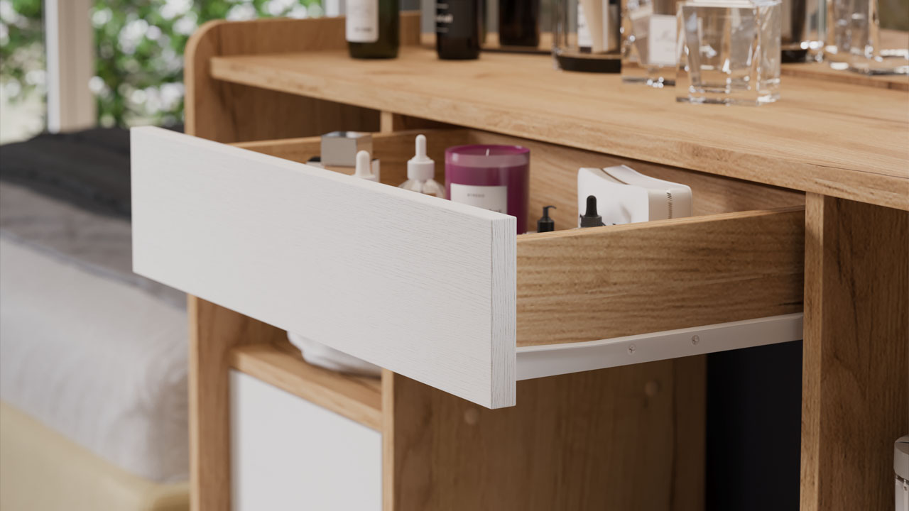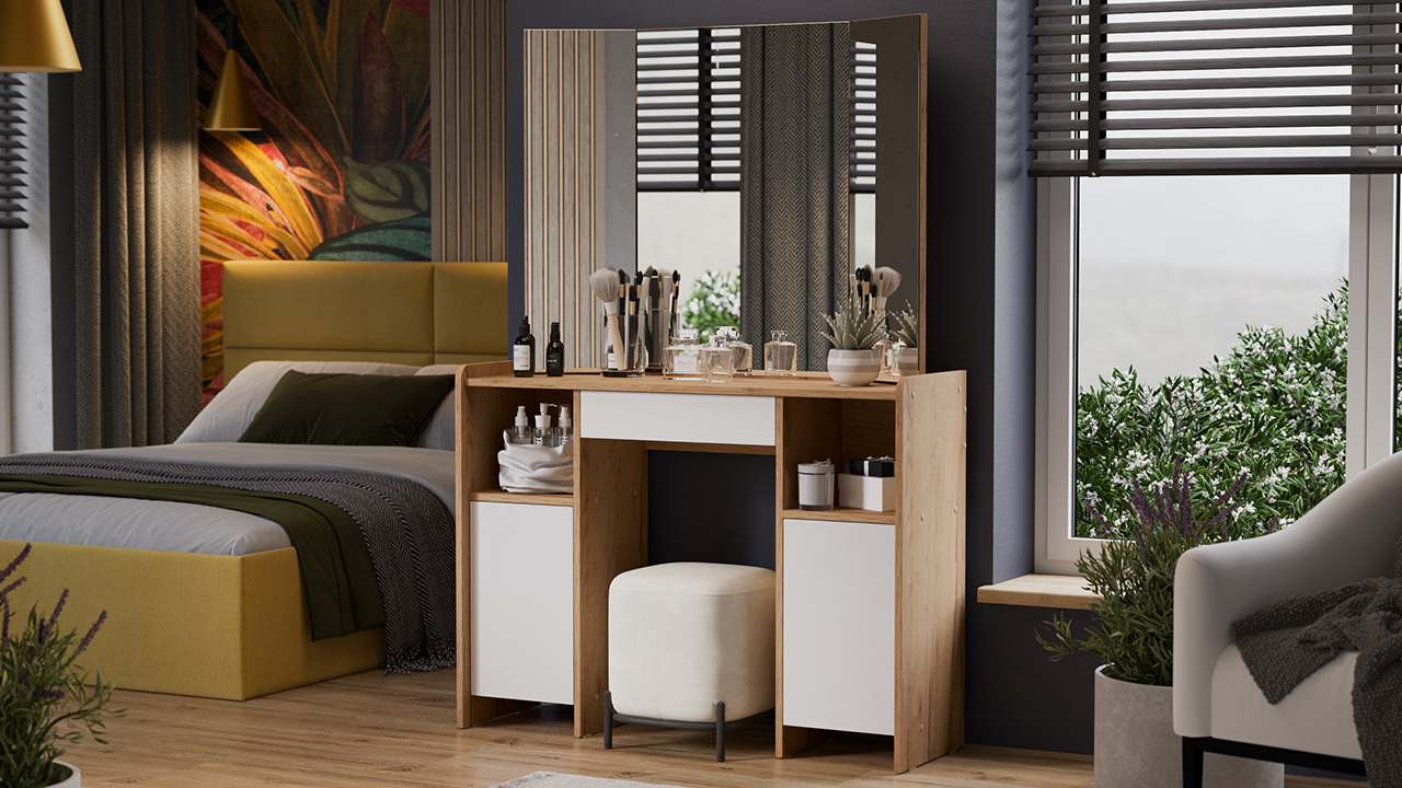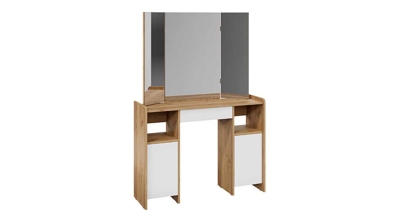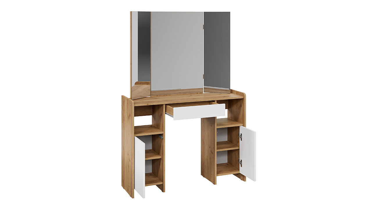 Функциональность. Помимо внешней привлекательности столы оборудованы зеркалами с подвижными створками, вместительной столешницей, под которой находится выдвигающийся ящик, открытой зоной для размещения нужных предметов и закрытой секцией с дверью, куда удобно складывать всю необходимую косметику и аксессуары. Эти удобные отделения помогают поддерживать порядок и комфорт в вашем личном пространстве для красоты.