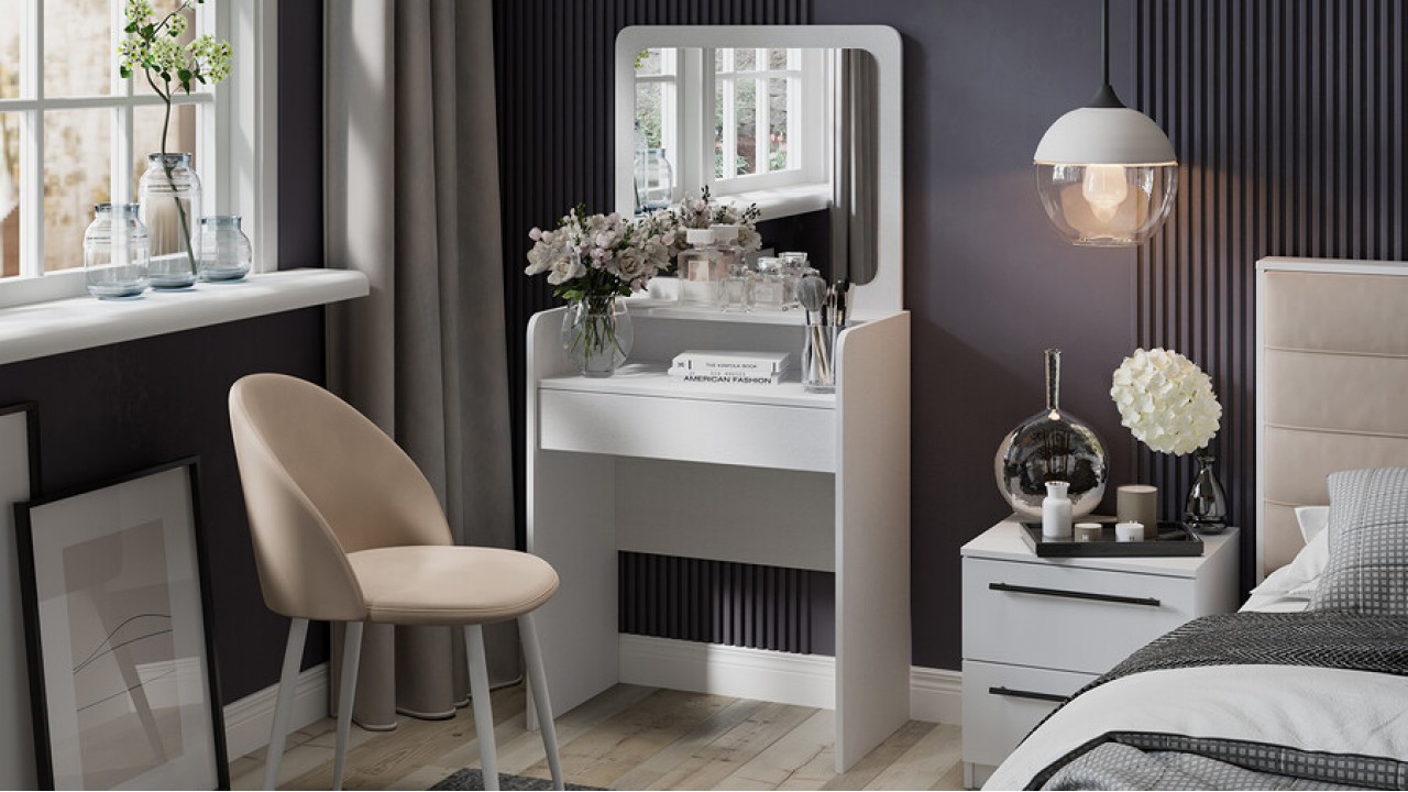 Универсальность текстуры. Туалетный стол «Эмма» в текстуре «Белый Ясень» идеально подойдет как для светлого помещения, так и для интерьеров в темных тонах, сделав комнату предметом особого внимания и притяжения.