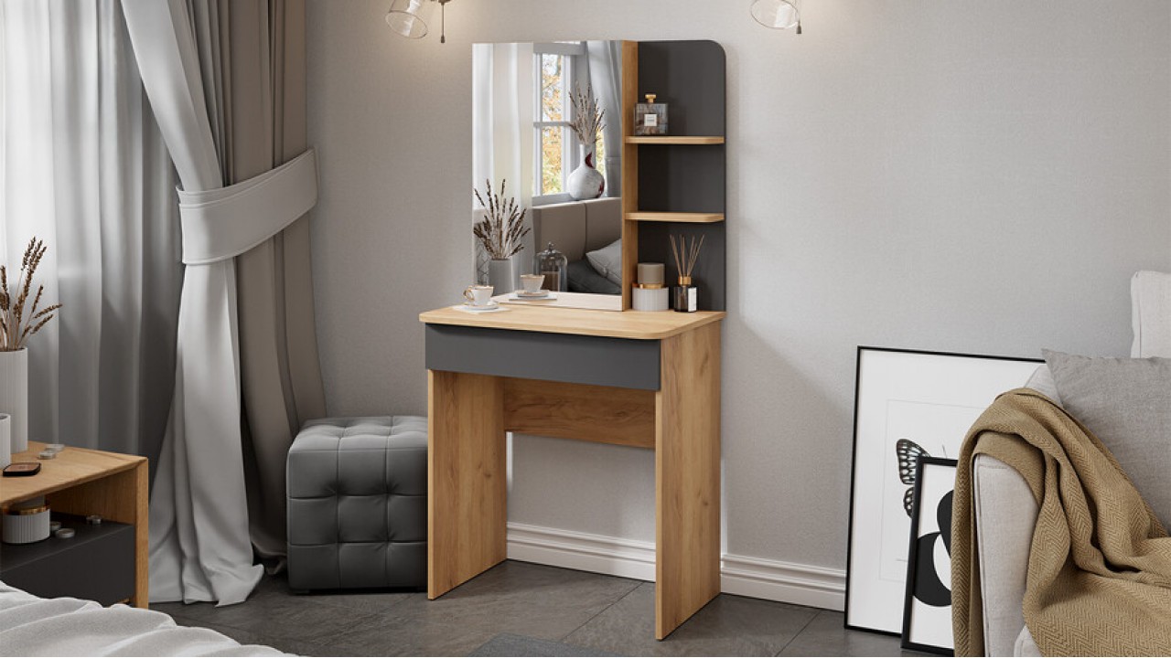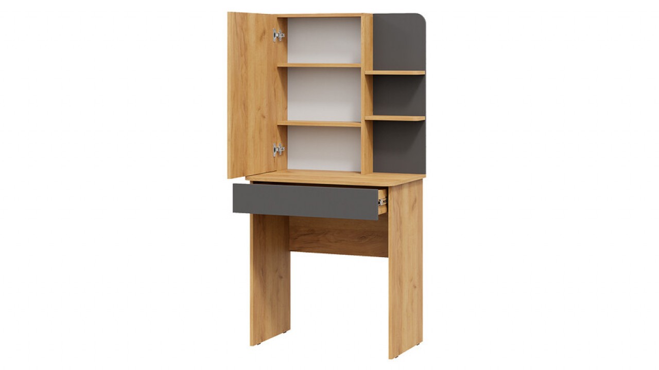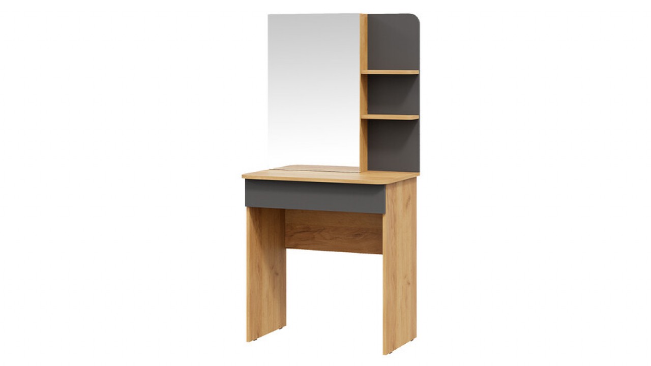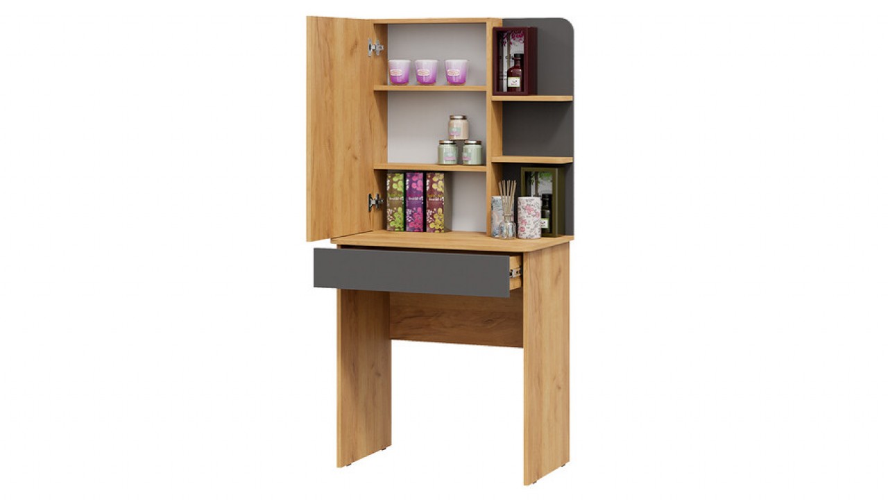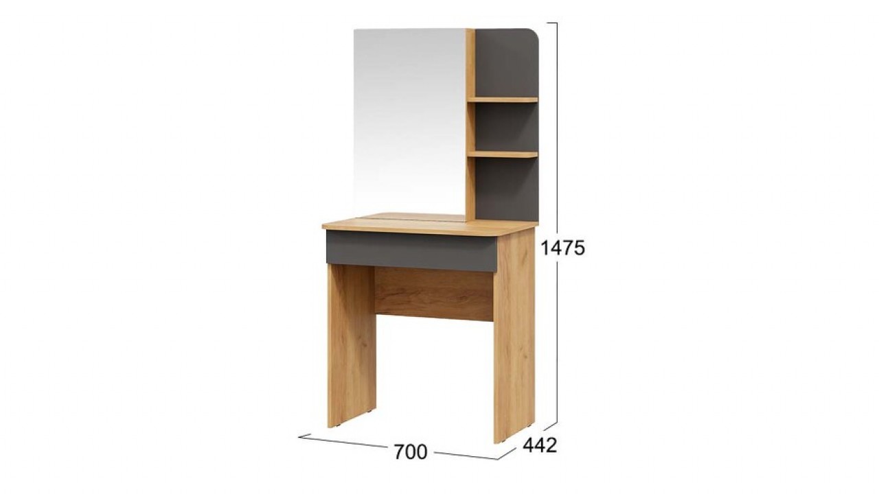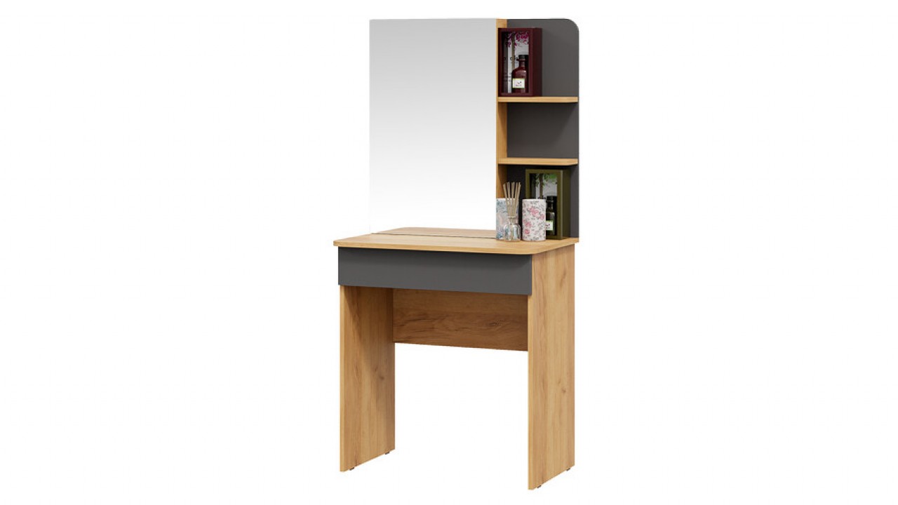 Туалетный стол «Майя» в новом цвете «Дуб Крафт Золотой/Серый Графит» совмещает в себе изящество и функционал, которые будут к месту в любой квартире. Дизайн. Новый декор туалетного стола «Майя» привнесет в интерьер новую энергию и сделают стол привлекательным акцентом в интерьере. Сочетание серого фасада с тёплым древесным оттенком каркаса позволит оформить комнату практически в любом стилистическом направлении, ведь эти декоры хорошо сочетаются с различными оттенками интерьера. Открытые полки в текстуре «Дуб Крафт Золотой» являются лаконичными акцентами, которые придают туалетному столу утонченность и изысканность. Функциональность. Несмотря на свои компактные размеры, туалетный стол имеет функциональный ящик с шариковыми направляющими для хранения парфюмерии, достаточно вместительную столешницу, где можно разместить все необходимые аксессуары и полноценное зеркало, которое имеет дополнительное место с полками для хранения за дверцей. Каркас/Фасад: ЛДСП 16 мм Кромка: ПВХ 0,4 мм Направляющие: шариковые Максимальная нагрузка на крышку стола: 50 кг Максимальная нагрузка на ящик: 10 кг Открывание: захватом рукой ДокументыСкачать паспорт (pdf 3.5 Мб) |