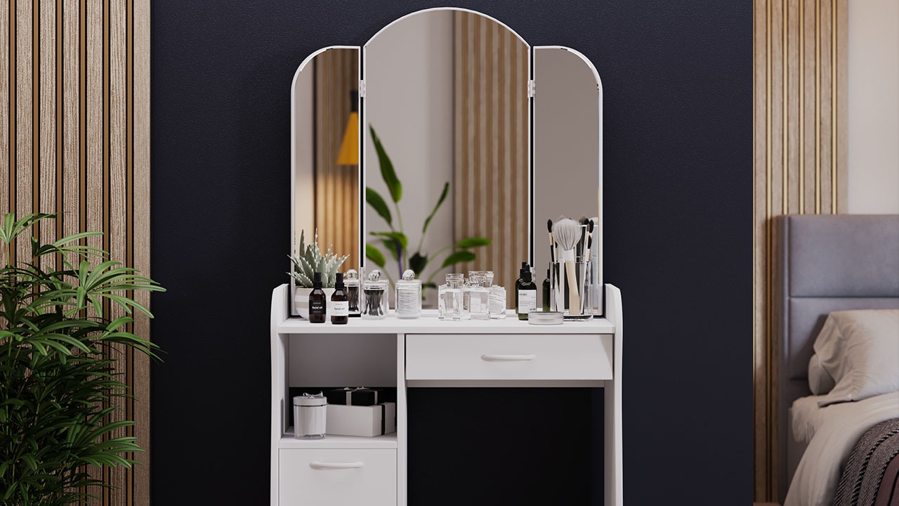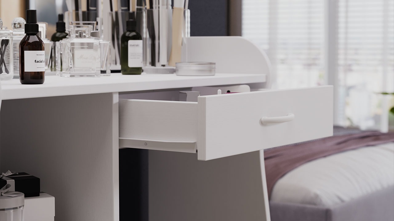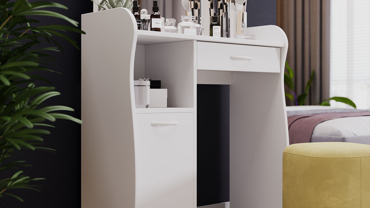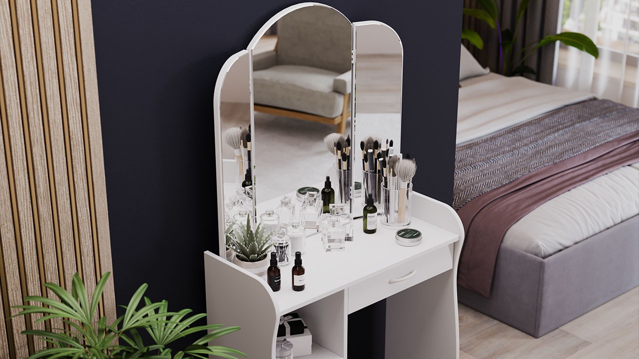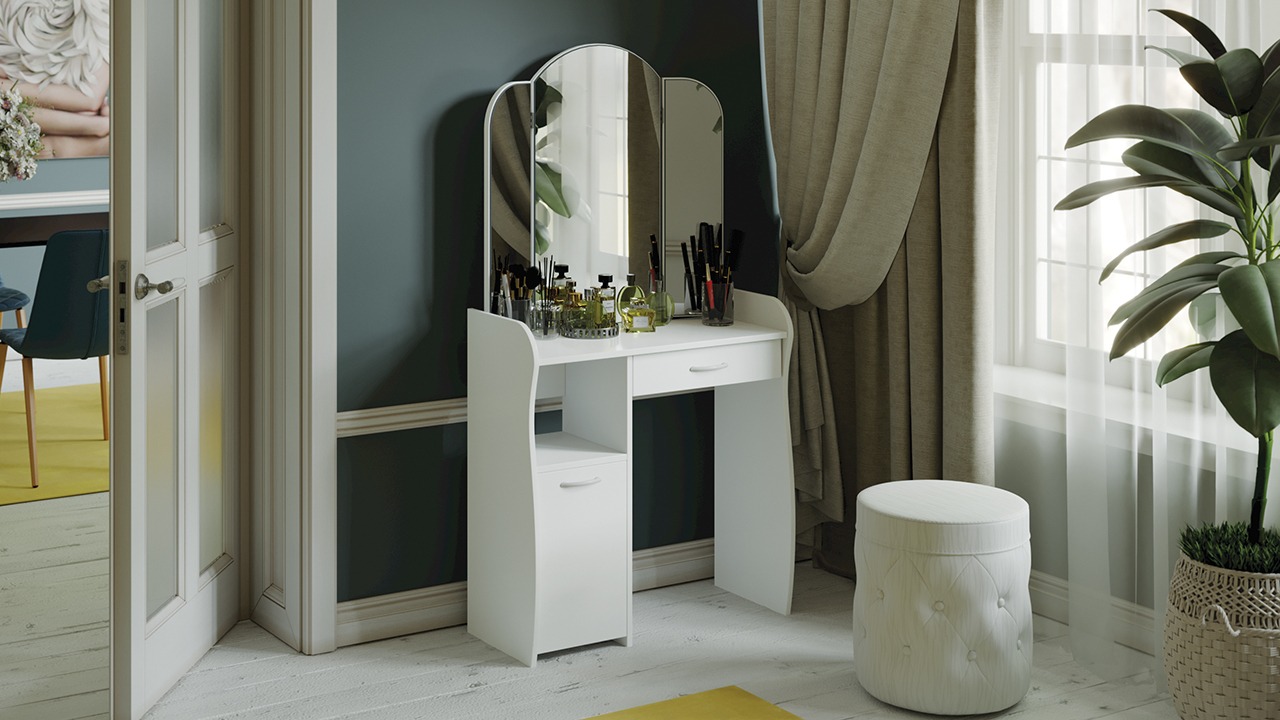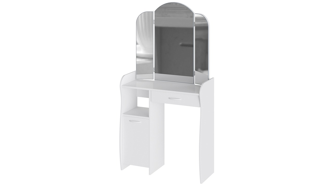 Функциональность. Помимо внешней привлекательности стол оснащен большим зеркалом с поворотными зеркальными створками, вместительную столешницу под которой располагается выдвижной ящик, открытая ниша для хранения и секция с дверцей, где можно разместить все необходимые аксессуары и косметику. Удобные отсеки помогут поддерживать порядок и удобство в Вашем уголке красоты.