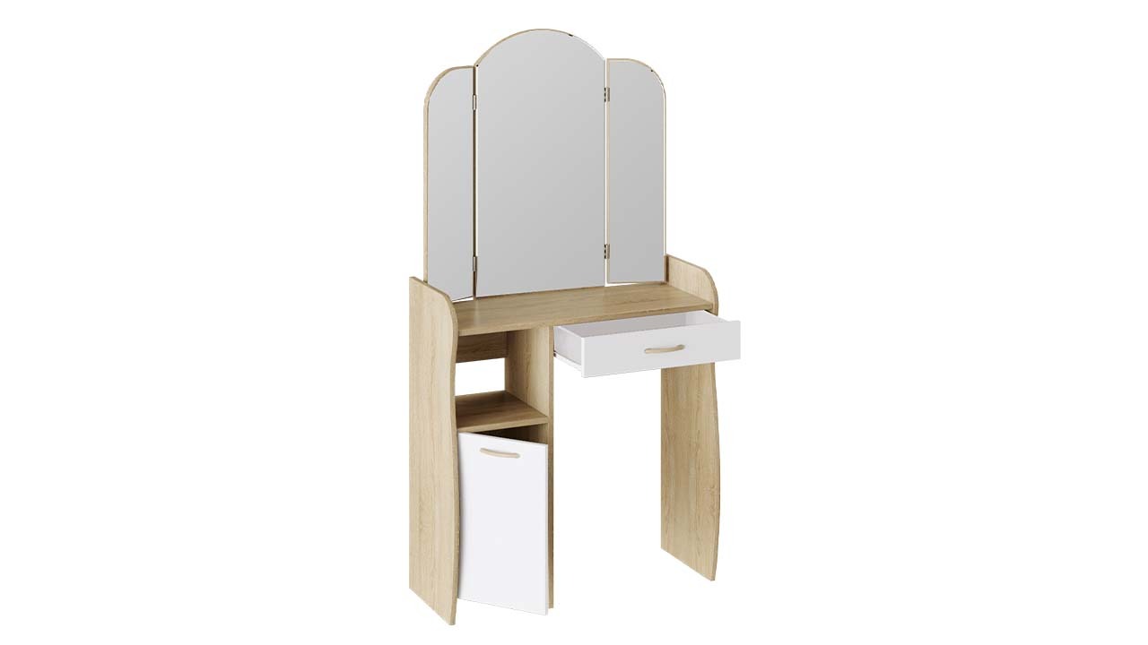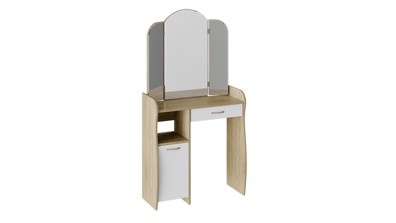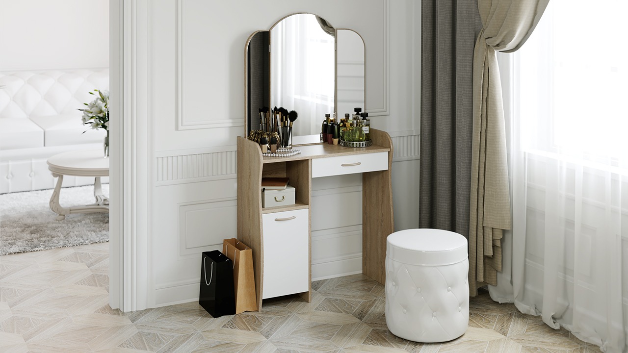 Функциональность. Помимо внешней привлекательности стол оснащен большим зеркалом с поворотными зеркальными створками, вместительную столешницу под которой располагается выдвижной ящик, открытая ниша для хранения и секция с дверцей, где можно разместить все необходимые аксессуары и косметику. Удобные отсеки помогут поддерживать порядок и удобство в Вашем уголке красоты.