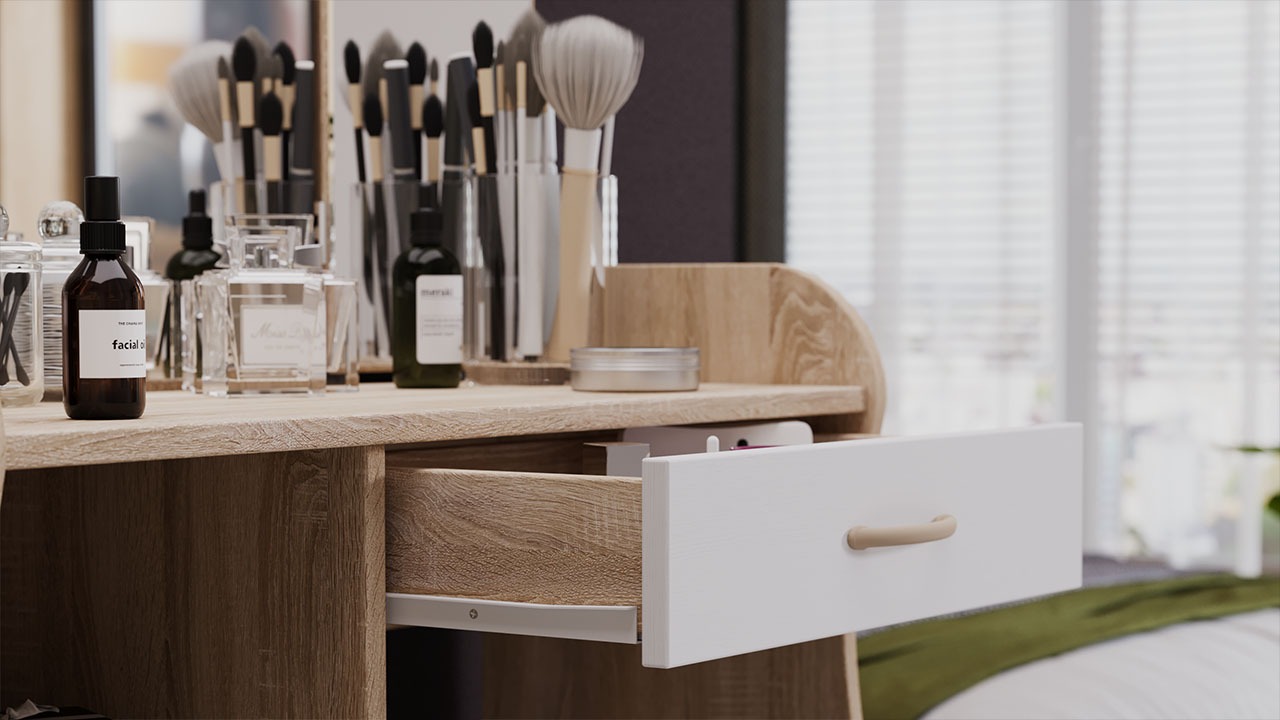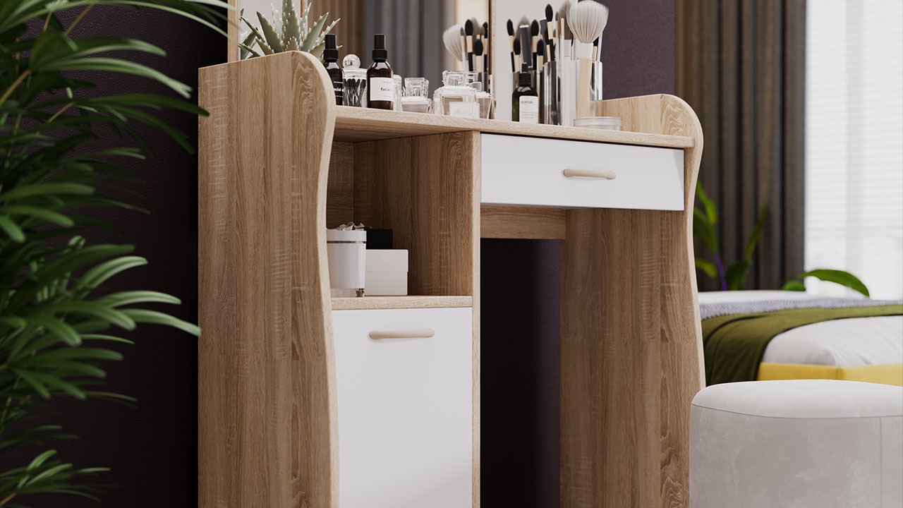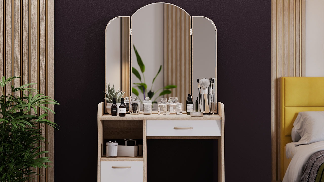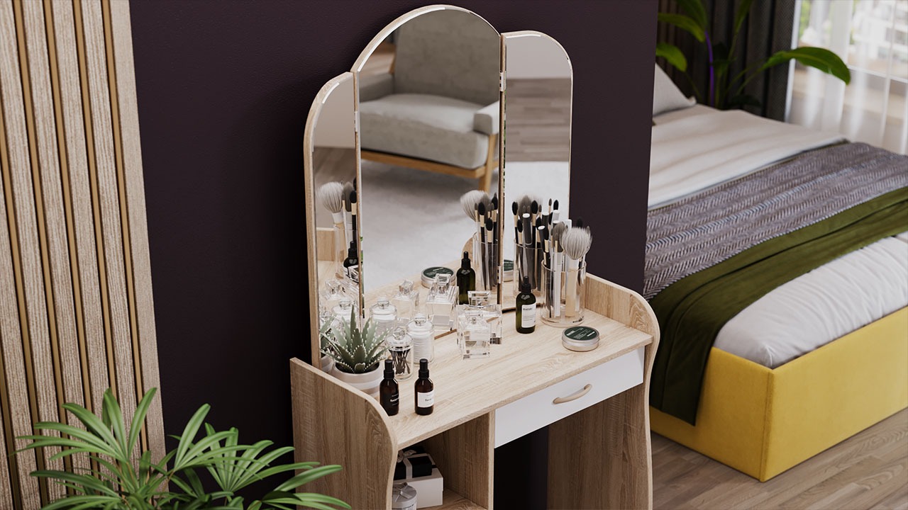 Функциональность. Помимо внешней привлекательности стол оснащен большим зеркалом с поворотными зеркальными створками, вместительную столешницу под которой располагается выдвижной ящик, открытая ниша для хранения и секция с дверцей, где можно разместить все необходимые аксессуары и косметику. Удобные отсеки помогут поддерживать порядок и удобство в Вашем уголке красоты.
